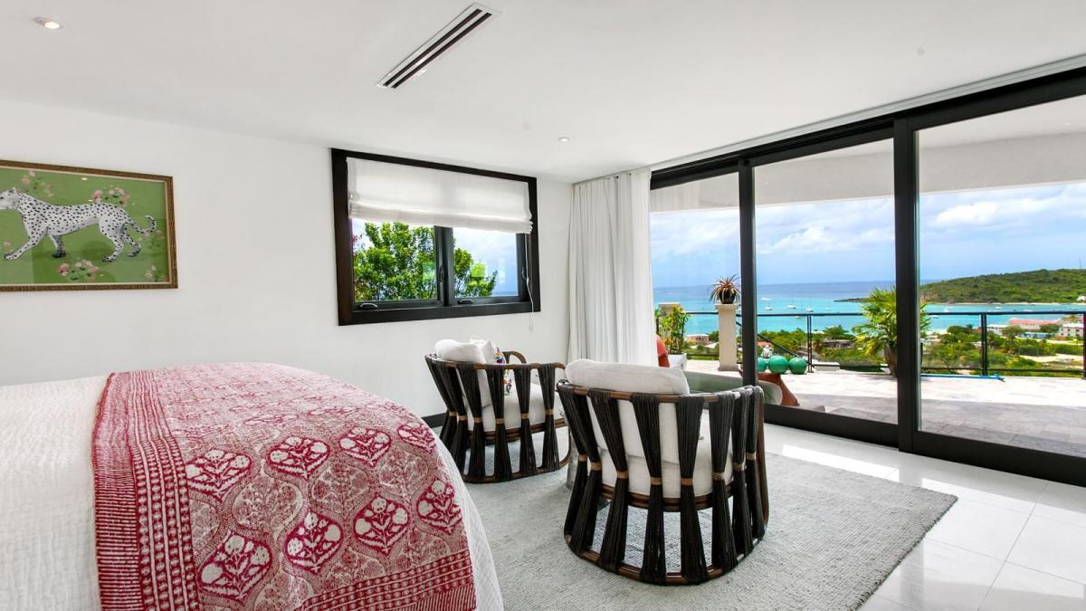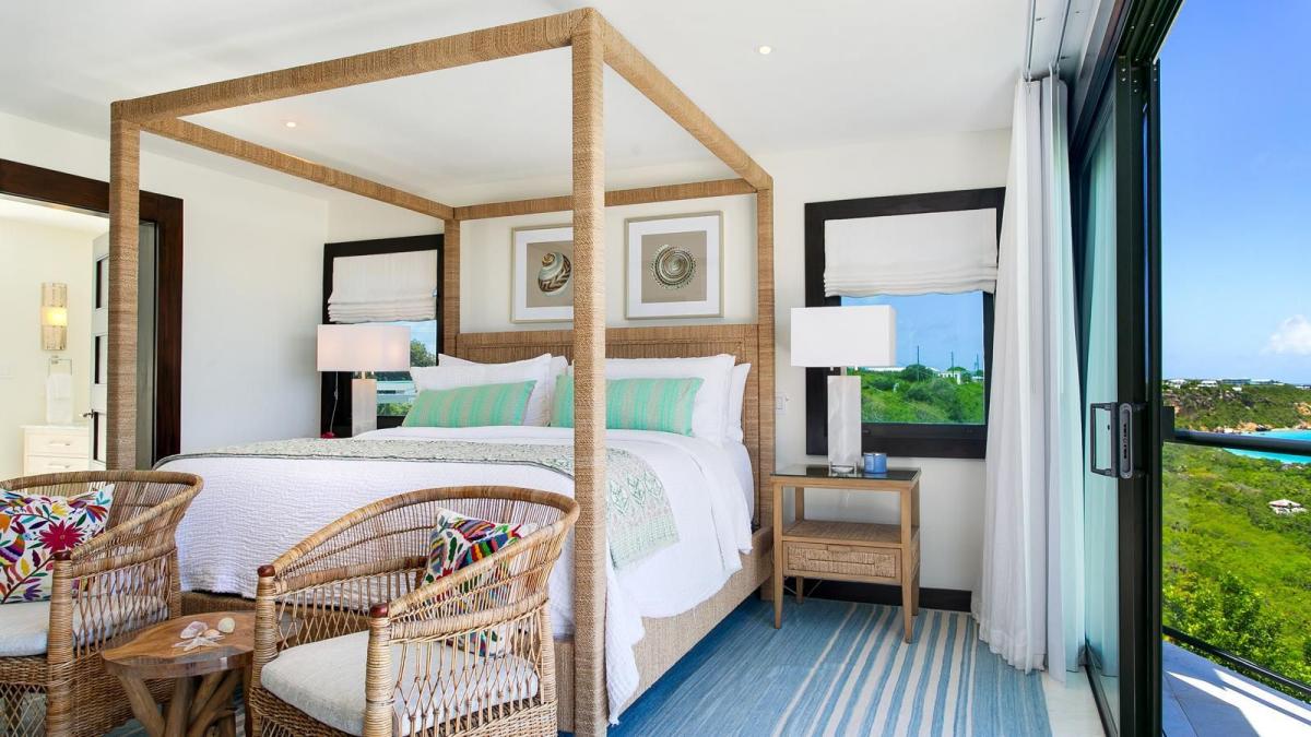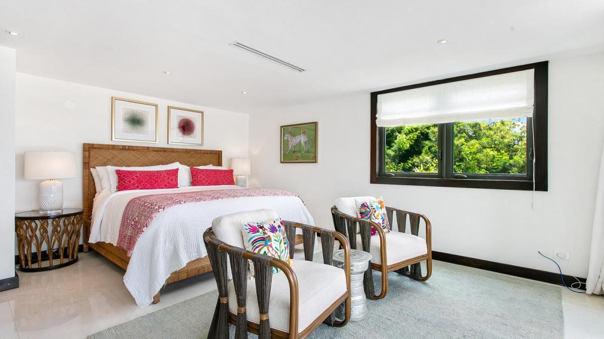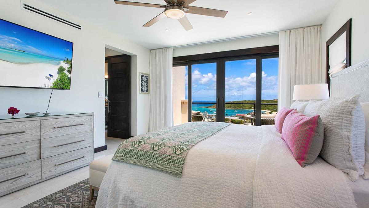 Primary Bedroom: This room is located on the upper level and is equipped with a king-sized bed, air conditioning, television, a sitting area, and an ensuite bathroom with an open-air outdoor walk-in shower and soaking bathtub, and double vanities. The primary bedroom also opens onto a private furnished balcony overlooking the ocean and Sandy Ground Bay.