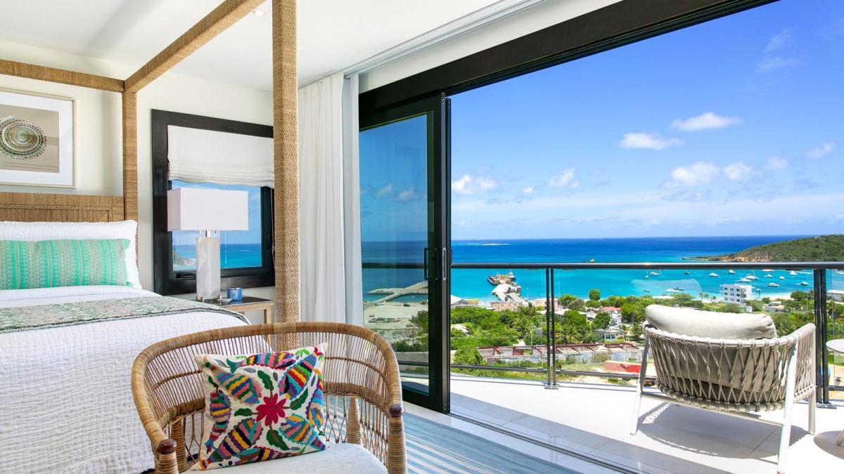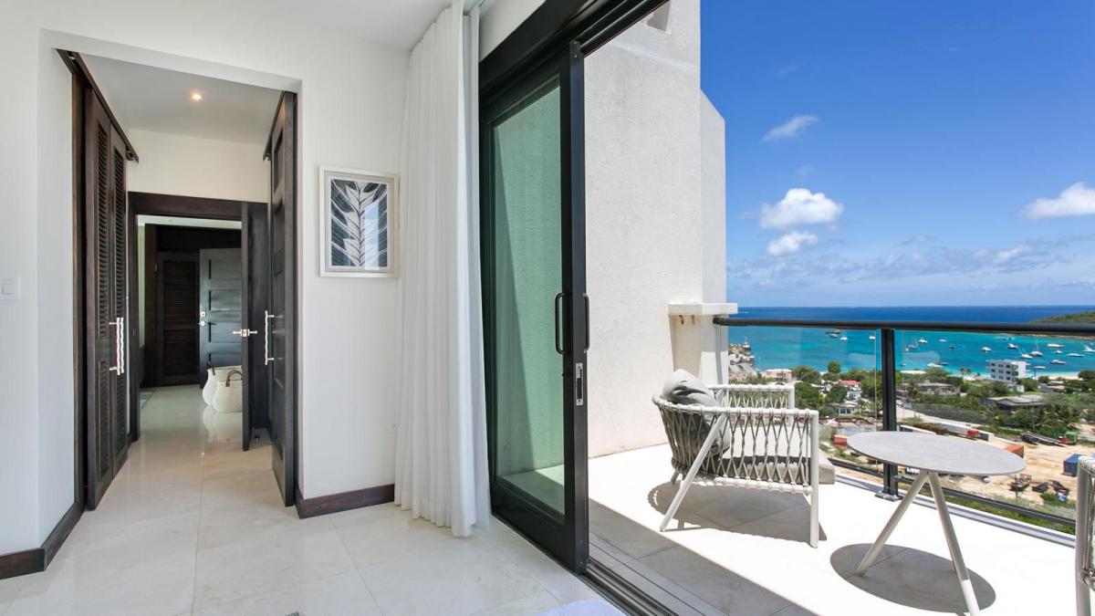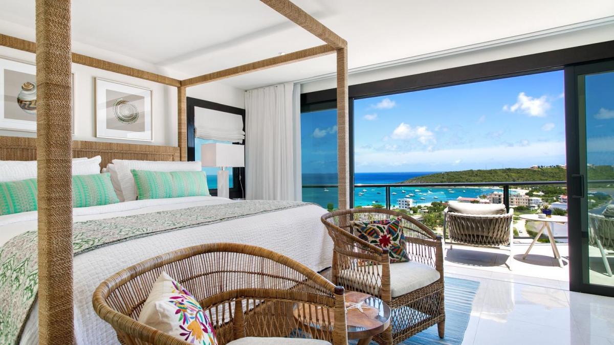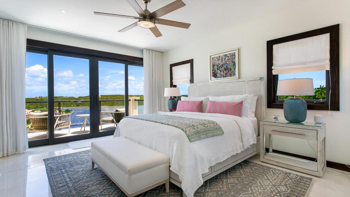 Primary Bedroom: This room is located on the upper level and is equipped with a king-sized bed, air conditioning, television, a sitting area, and an ensuite bathroom with an open-air outdoor walk-in shower and soaking bathtub, and double vanities. The primary bedroom also opens onto a private furnished balcony overlooking the ocean and Sandy Ground Bay.