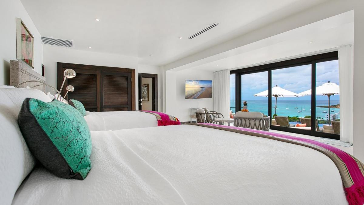 Bedroom 4: This room is located on the pool level and is equipped with two queen-sized beds, air conditioning, a television, a sitting area, and an ensuite bathroom with a walk-in shower and double vanities. Bedroom 4 also opens onto a furnished terrace with direct access to the pool deck which overlooks the ocean and Sandy Ground Bay.