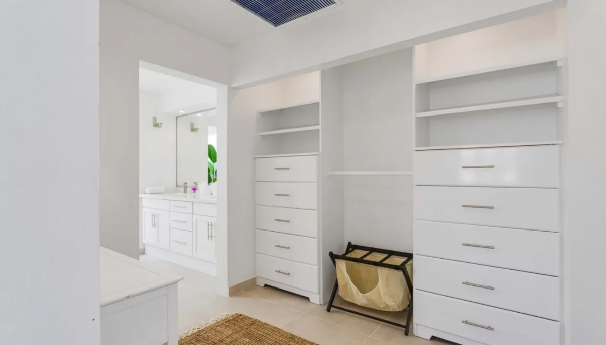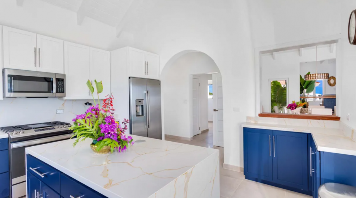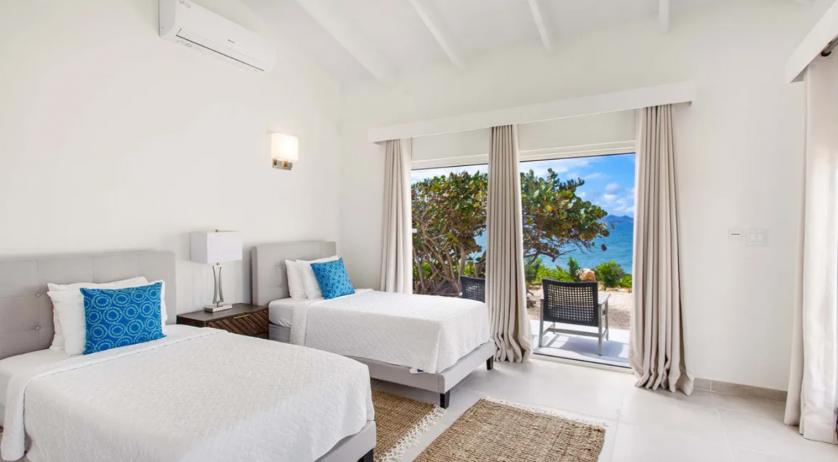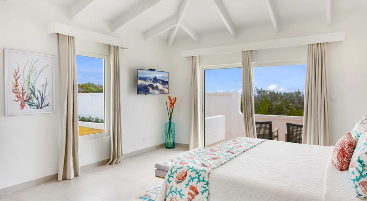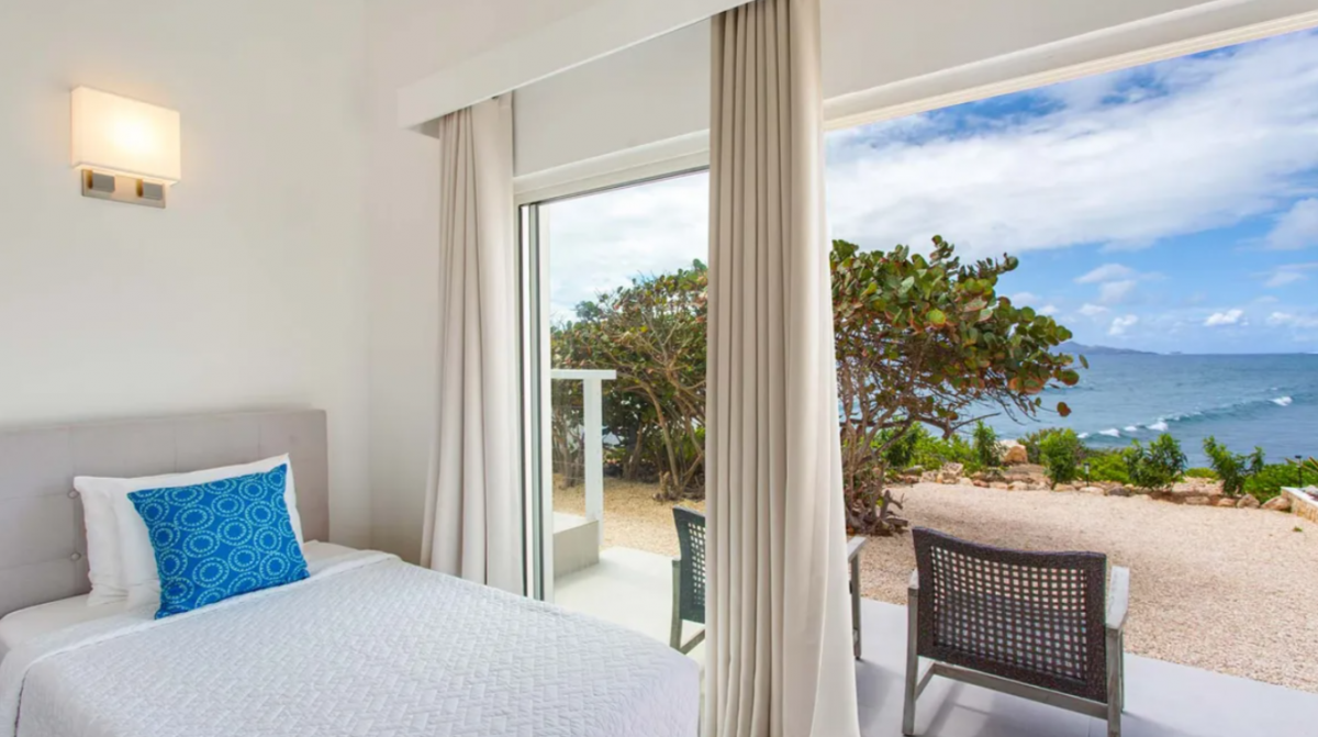 Bedroom 1: This room is located in the Main House and is equipped with a king-sized bed, a walk-in closet, air conditioning, a ceiling fan, a television, a desk, and an ensuite bathroom with a shower. Bedroom 1 also has a furnished verandah that overlooks the sea and the island of St. Martin in the distance.