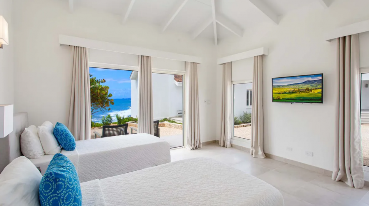 Bedroom 2: This room is located in the Main House and is equipped with a king-sized bed, air conditioning, a ceiling fan, a television, a desk, and an ensuite bathroom with a shower. Bedroom 2 also has a furnished verandah that overlooks the sea and the island of St. Martin in the distance.