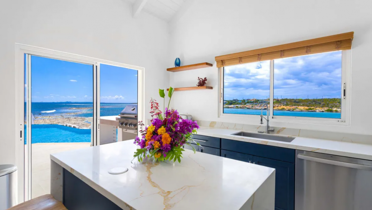 With floor-to-ceiling sliding doors, the common areas of this villa create a seamless indoor/outdoor living experience, allowing sea breezes to flow throughout. Whether it's a quiet movie night on the sofa, a family game night at the outdoor table, or an elegant meal on the custom-made dining table after a day in the sun, Angel Point is the ideal destination.