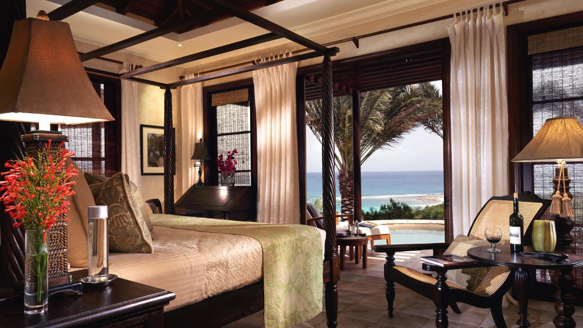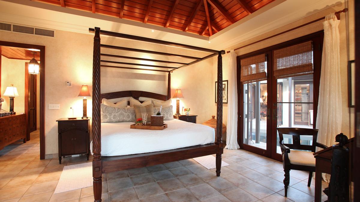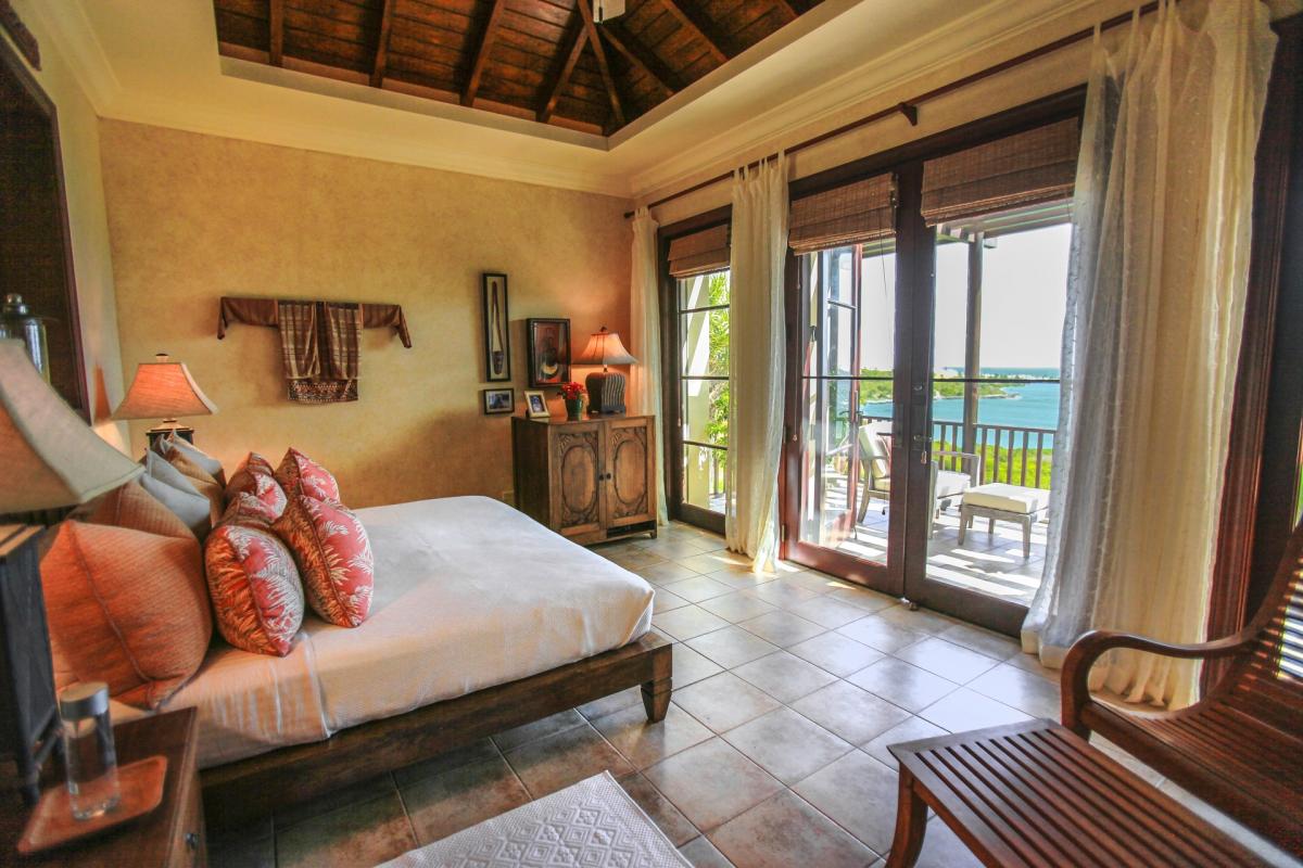 Bedroom 1: This room is located on the upper level and is equipped with a king-sized bed, a walk-in closet, air conditioning, a television, a fridge, and an ensuite bathroom with a bathtub, an indoor and outdoor shower, and double vanities. Bedroom 1 also has a private plunge pool and a verandah with lounge chairs that overlook the Caribbean Sea.