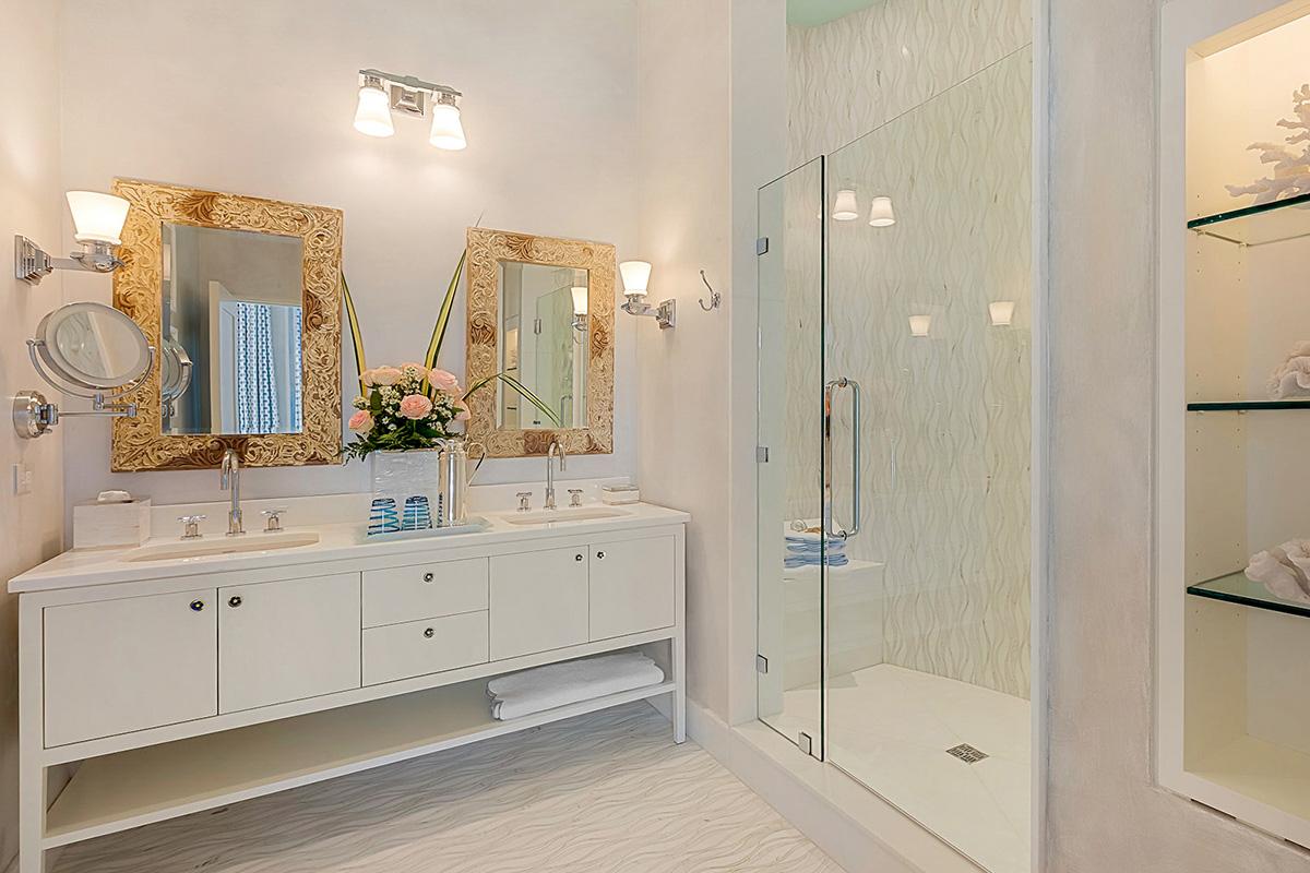 Bedroom 1: King bed, en suite bathroom with stand-alone shower, dual vanity, TV, safe, ceiling fan