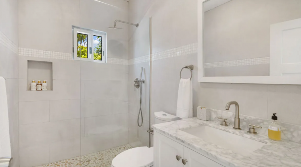 Bedroom 3: This room is equipped with a queen-sized bed, air conditioning, a ceiling fan, and a shared bathroom with a bathtub and shower combination.