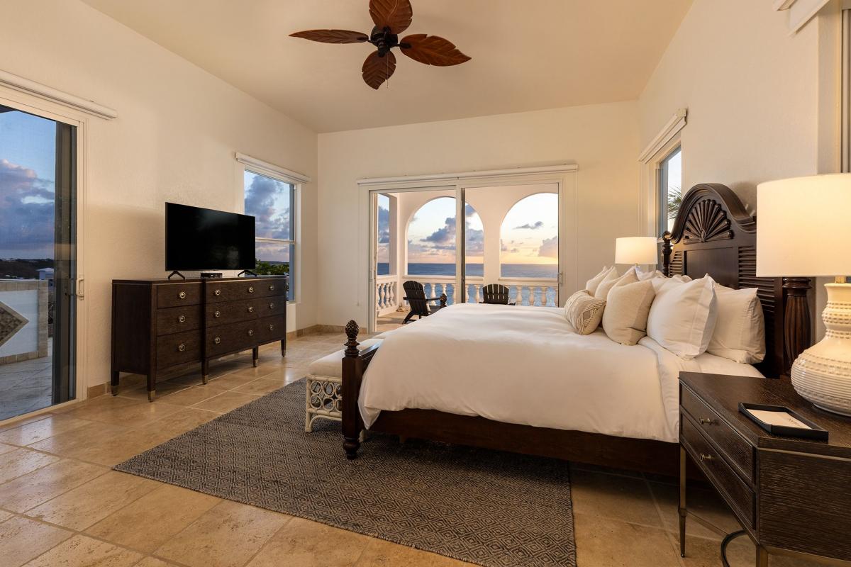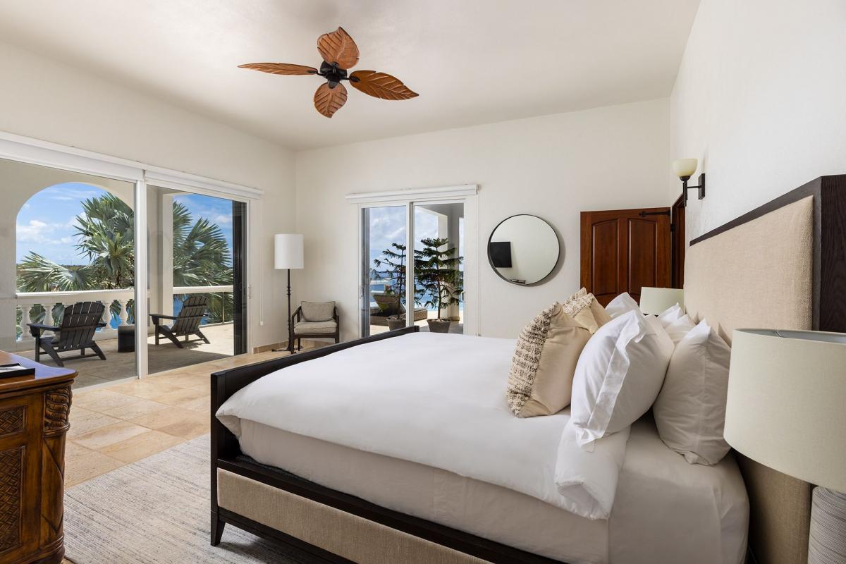 Bedroom 4: This room is located on the upper level and is equipped with a queen-sized bed, a safe, air conditioning, a ceiling fan, a television, and an ensuite bathroom with a shower. Bedroom 4 also opens onto a covered private furnished balcony with a sea view.