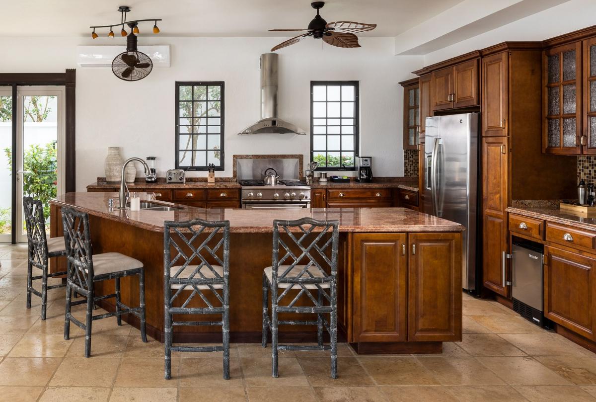 Grand Outlook is a 7,000+ square feet Anguilla rental nestled amidst breathtaking views near Crocus Bay, which is one of Anguilla's stunning beaches. Recently renovated in 2022, Grand Outlook features modern furnishings and finishes, complemented by charming wooden accents throughout the space. It offers four spacious bedrooms with expansive ocean views, each opening onto private patios perfect for enjoying Anguilla's stunning sunsets. Grand Outlook includes two primary king suites with large bathrooms and outdoor showers, as well as two queen suites with ensuite bathrooms.