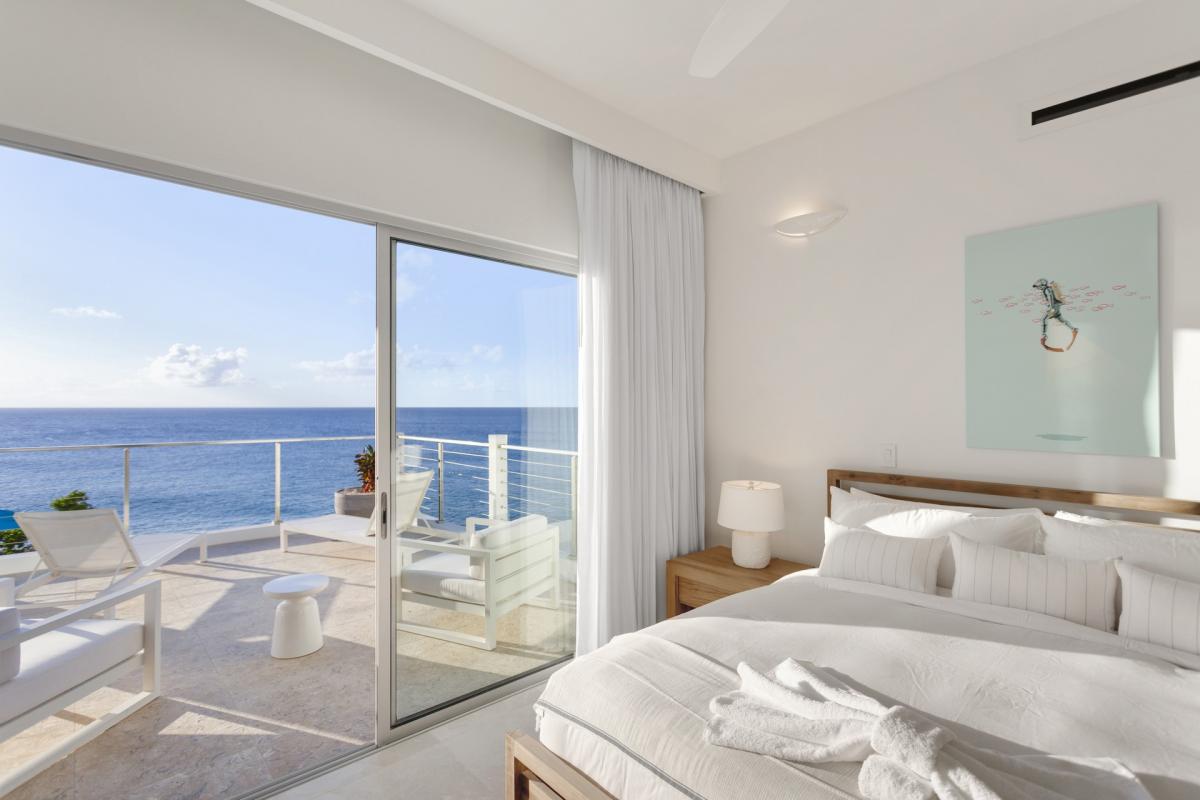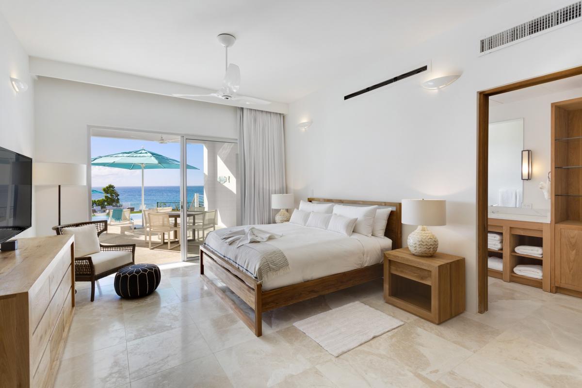 Bedroom 5: This room is located on the lower level of the main house and is equipped with a king-sized bed, a TV, AC, a ceiling fan, access to a furnished terrace leading to the pool that features an ocean view, and an ensuite bathroom with an indoor and outdoor shower.
