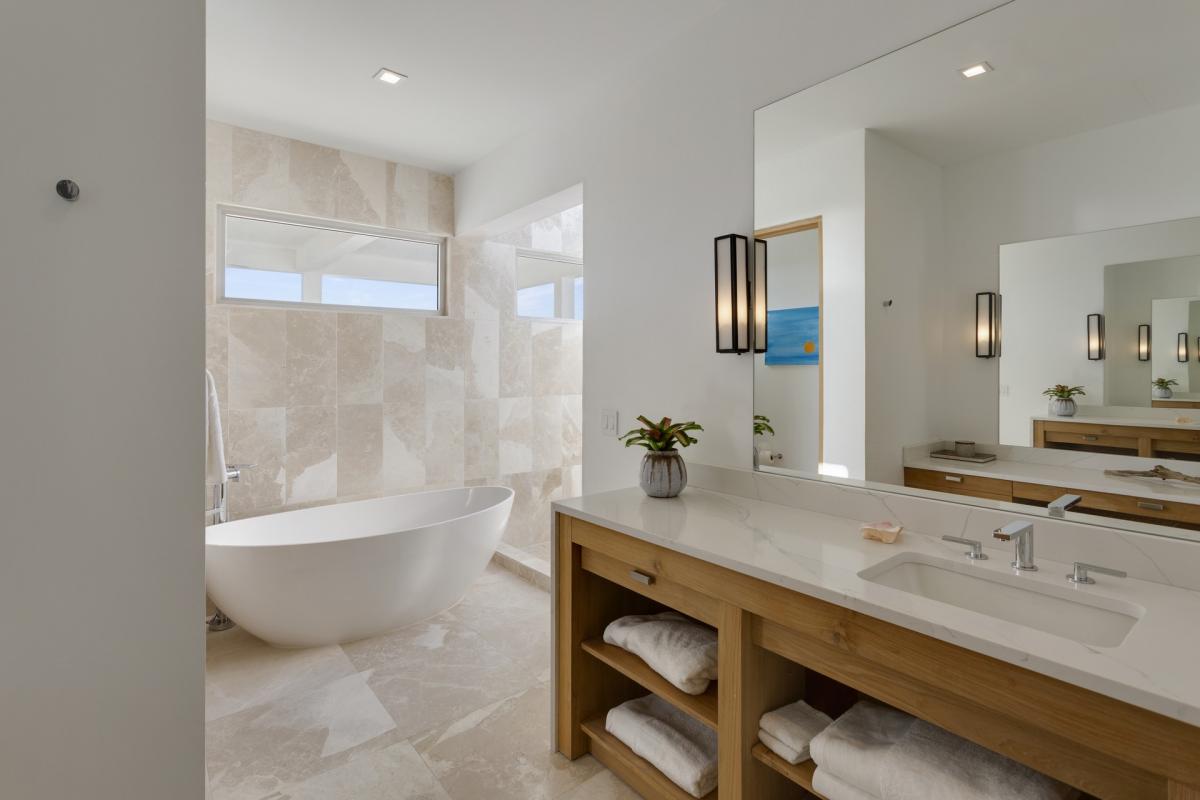 Primary Bedroom: This room is located on the upper level of the main house and is equipped with a king-sized bed, AC, ceiling fans, access to a furnished terrace with an ocean view, and an ensuite bathroom with a bathtub and shower.