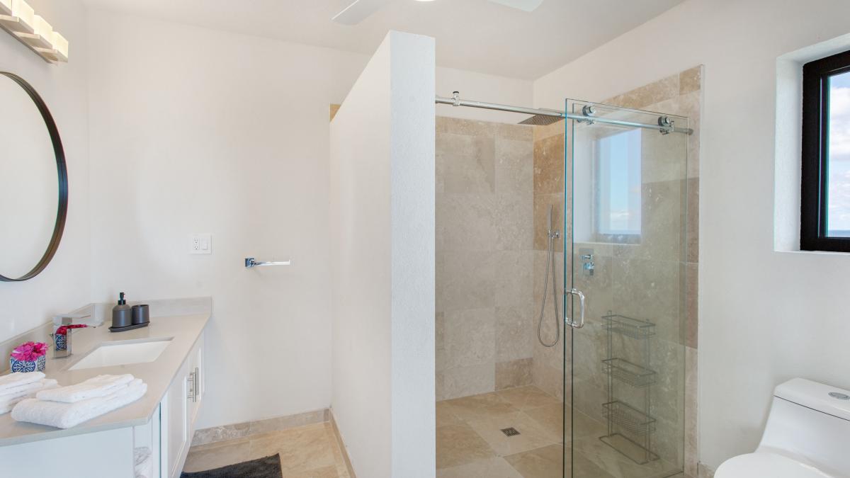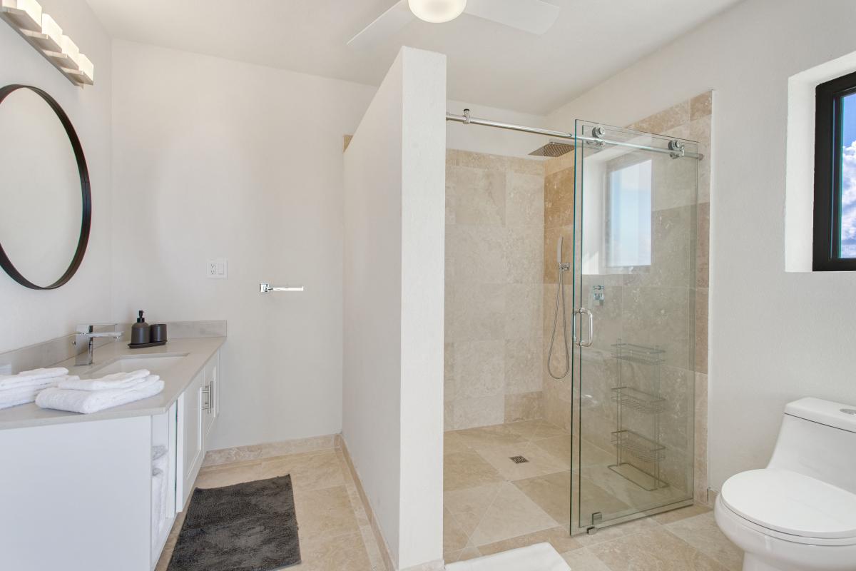 Bedroom 1: This room is equipped with a queen-sized bed, a walk-in closet, air conditioning, a ceiling fan, a seating area, and an ensuite bathroom with a walk-in shower with a rain head. Bedroom 1 also has direct access to a balcony with an ocean view.