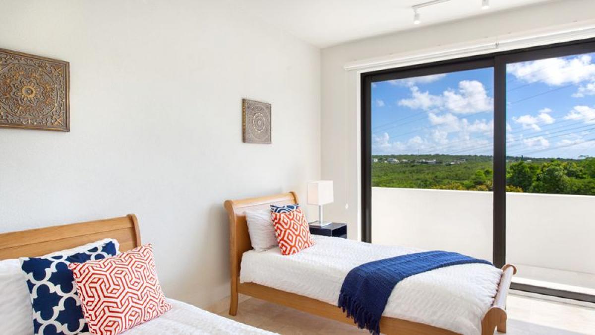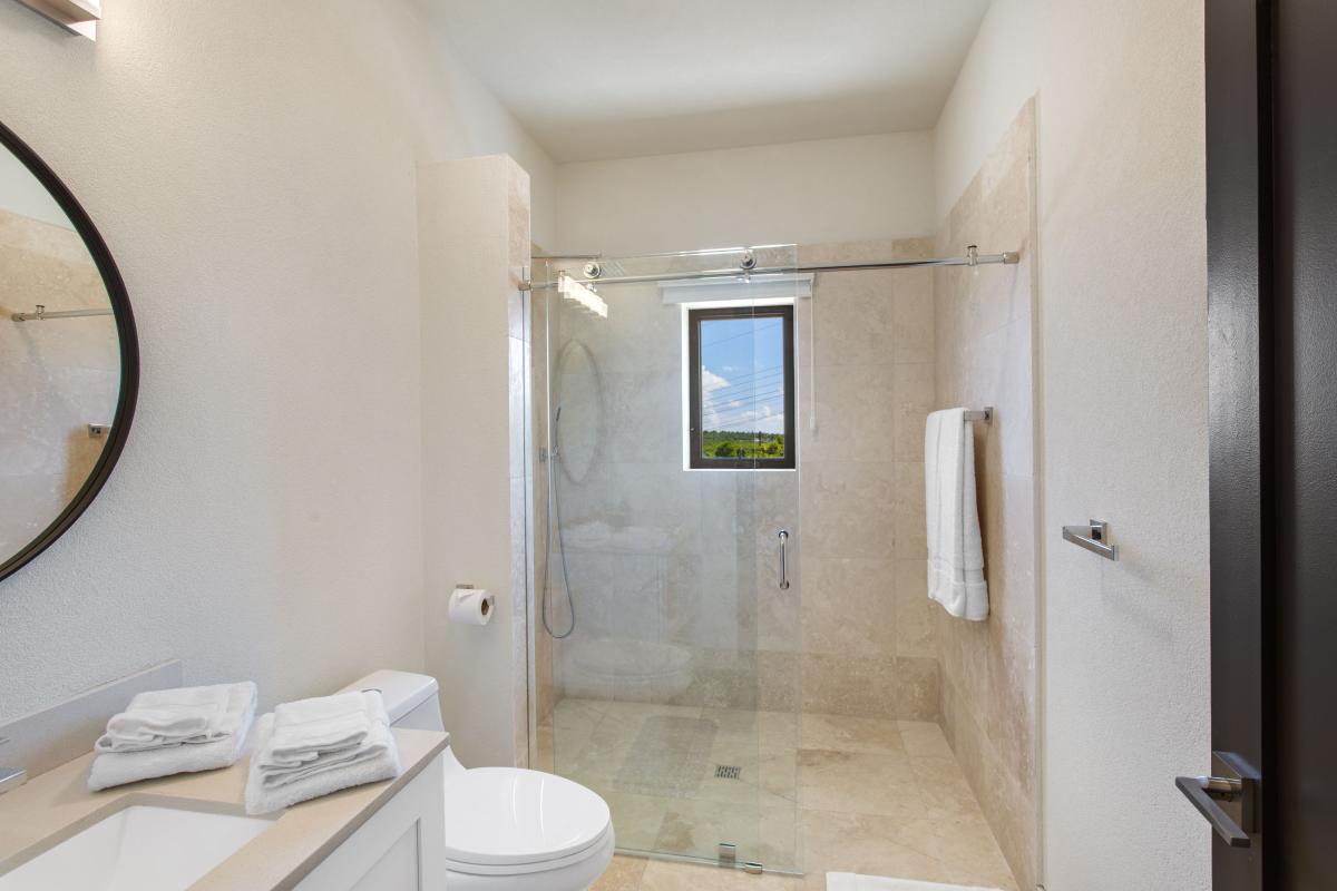 Bedroom 3: This room is equipped with two twin-sized beds (which can be converted into a king-sized bed), a walk-in closet, air conditioning, a ceiling fan, and an ensuite bathroom with a walk-in shower with a rain head. Bedroom 3 also has direct access to a balcony with an ocean view.