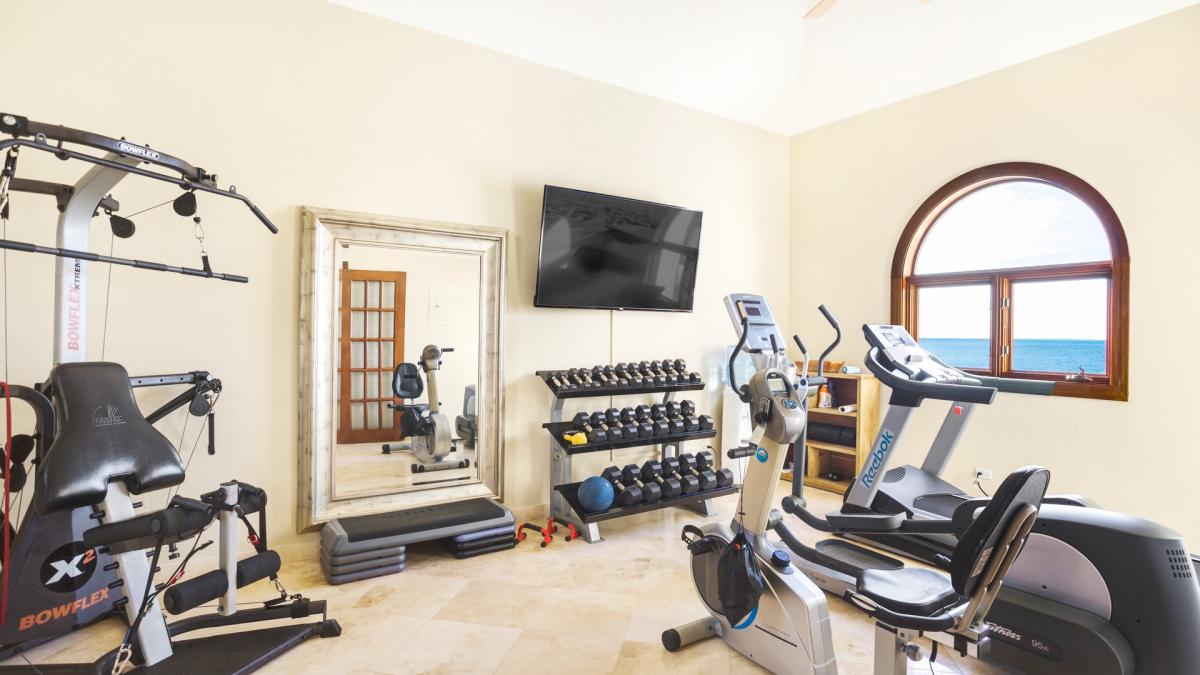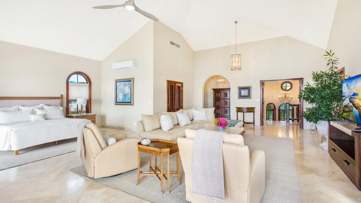 Bedroom 5: This room is located on the main level and it is equipped with one king-sized bed, air conditioning, a television, and an ensuite bathroom with a walk-in shower. This room also opens onto a patio with access to the pool area with Caribbean sea views.