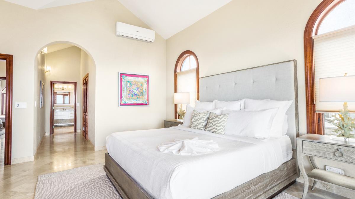 Primary Bedroom 2: This room is located on the upper level and is equipped with a king-sized bed, air conditioning, a ceiling fan, and an ensuite bathroom with a walk-in shower and walk-in closet. This room also opens onto a furnished balcony with a Caribbean sea view.