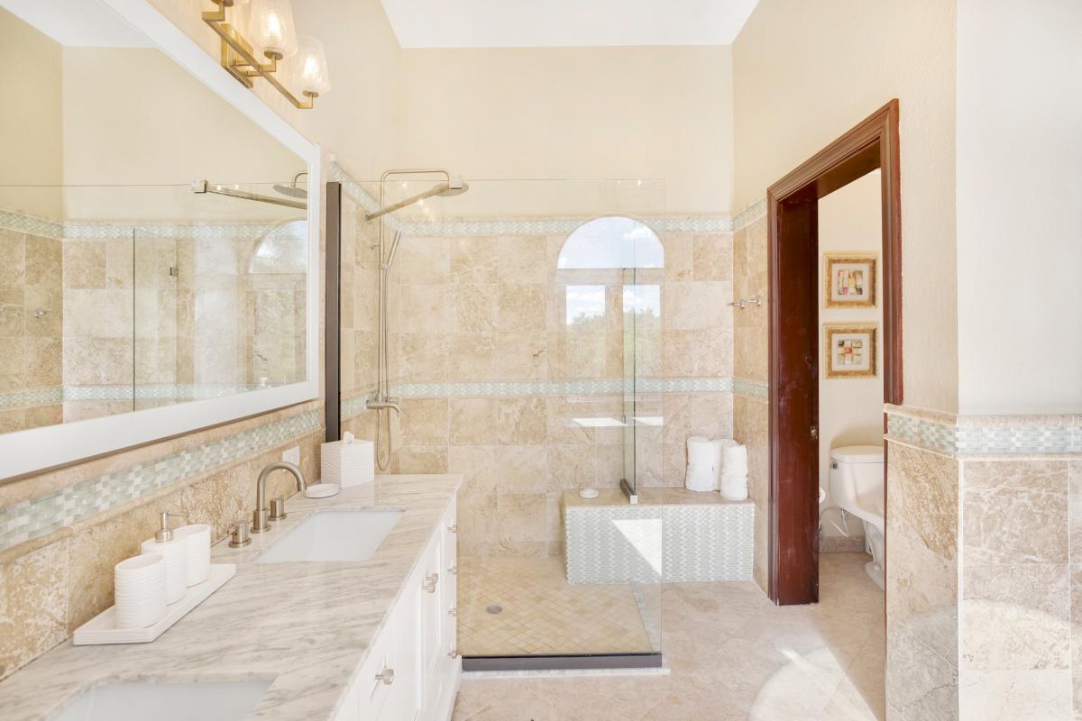 Primary Bedroom 1: This room is located on the upper level and is equipped with a king-sized bed, air conditioning, a ceiling fan, a television, a lounge area, a desk, and an ensuite bathroom with a soaking bathtub, an outdoor shower, and double vanities. This room also opens onto a furnished balcony with a Caribbean sea view.