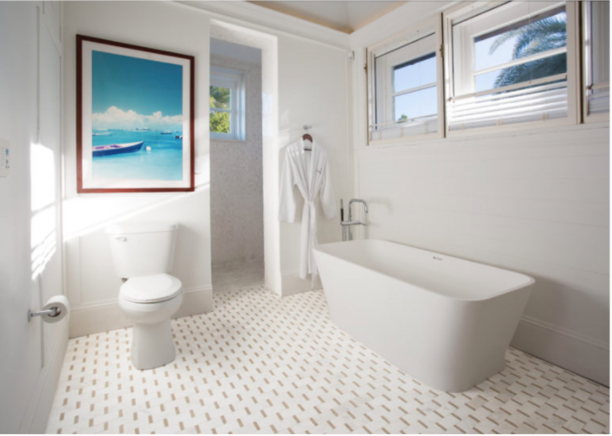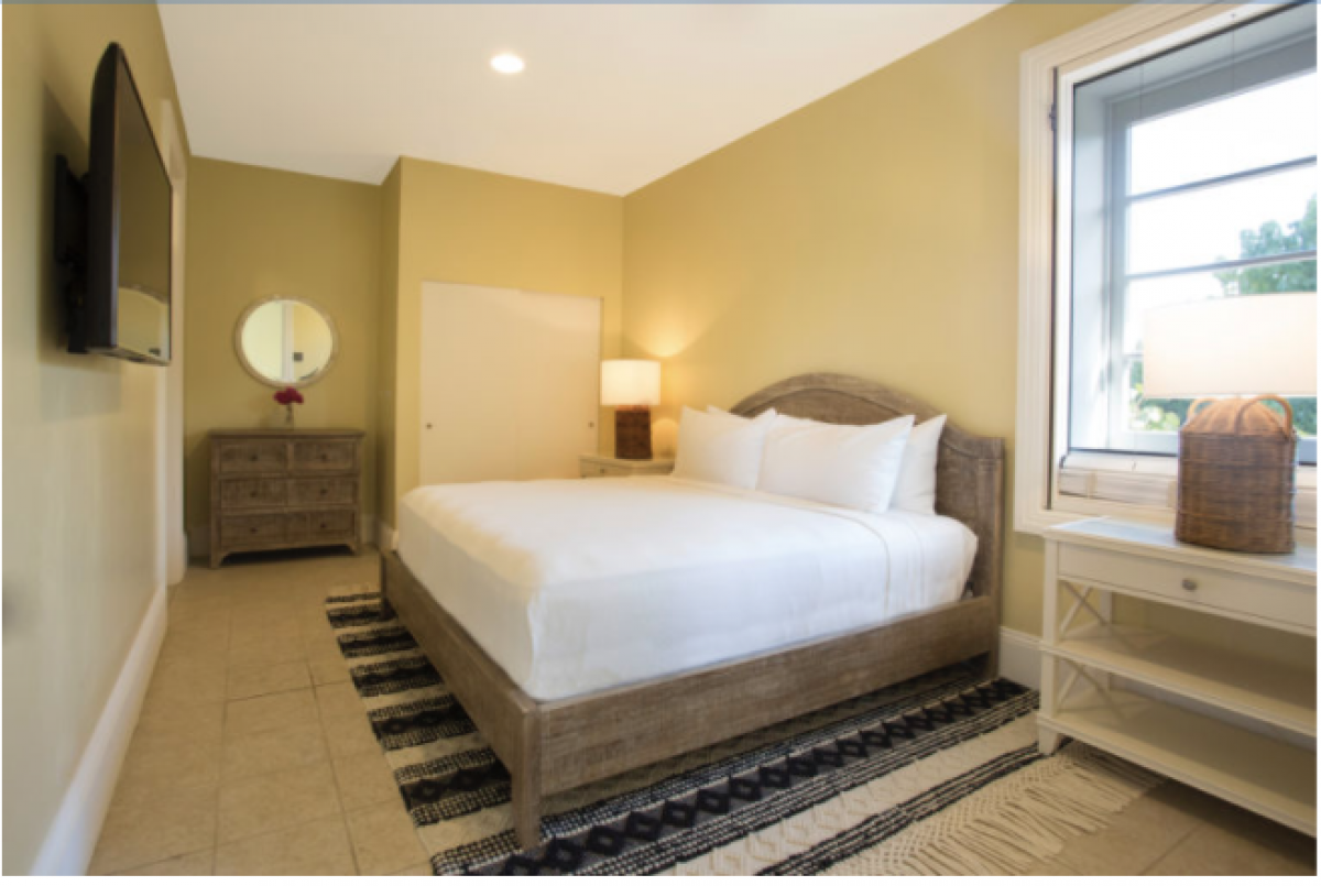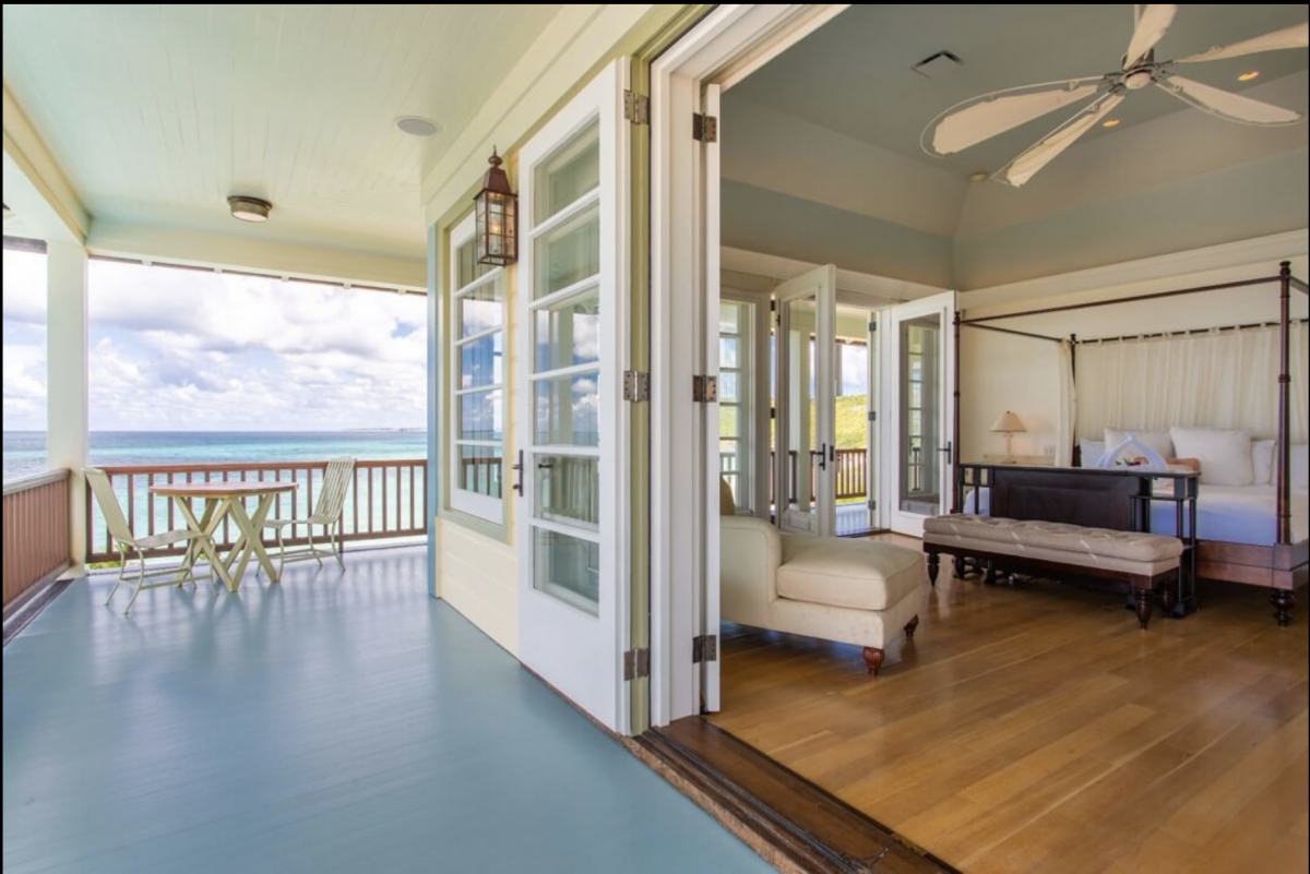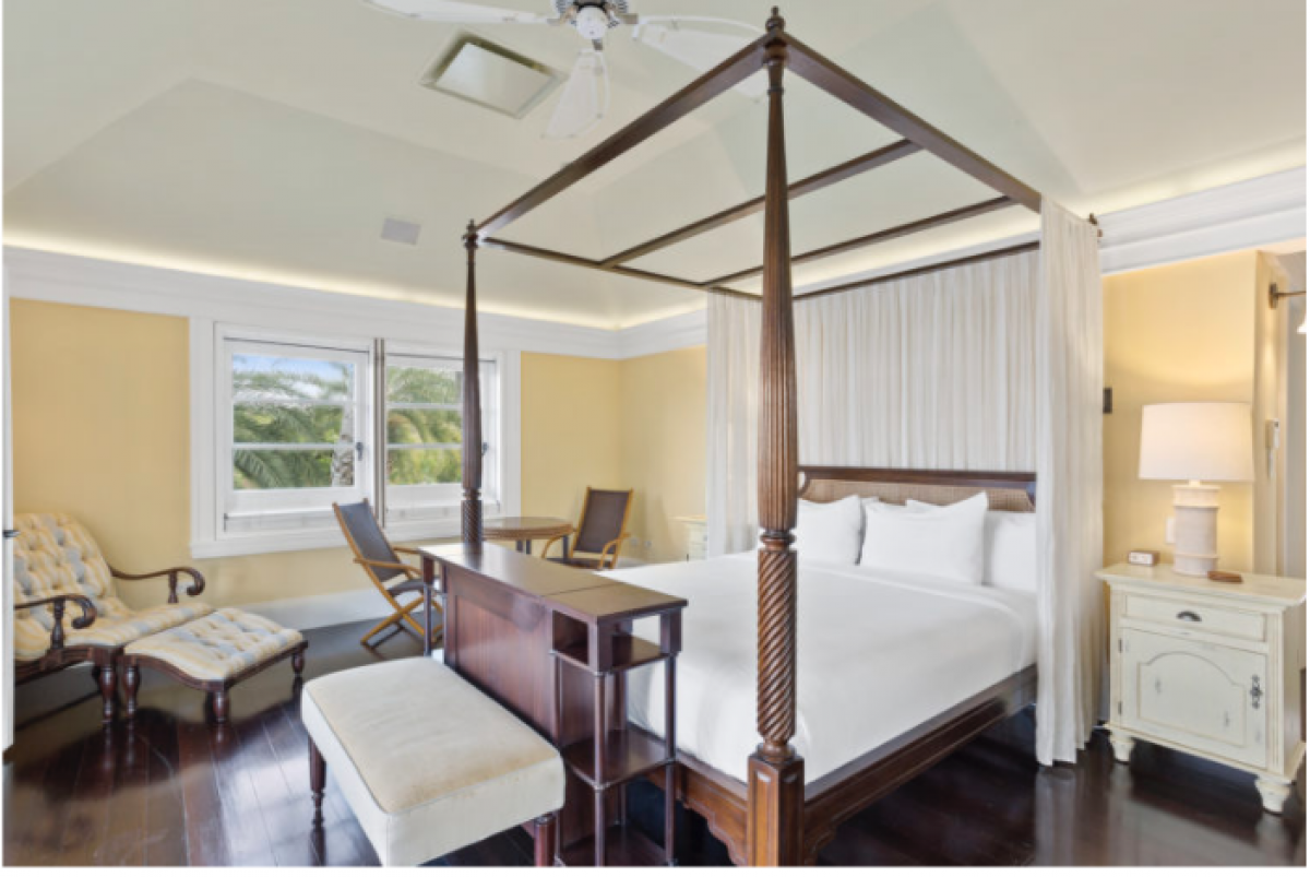 Bedroom 7: This room is located in the Great House on the second level. It is equipped with a king-sized bed, air conditioning, access to the terrace, and an ensuite bathroom with a bathtub, indoor and outdoor shower, and double vanities.