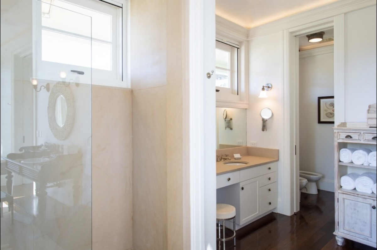 Bedroom 5: This room is located in the Guest House on the first level. It is equipped with a king-sized bed, air conditioning, access to the terrace with a garden view, and an ensuite bathroom with a bathtub, indoor and outdoor shower, and double vanities.