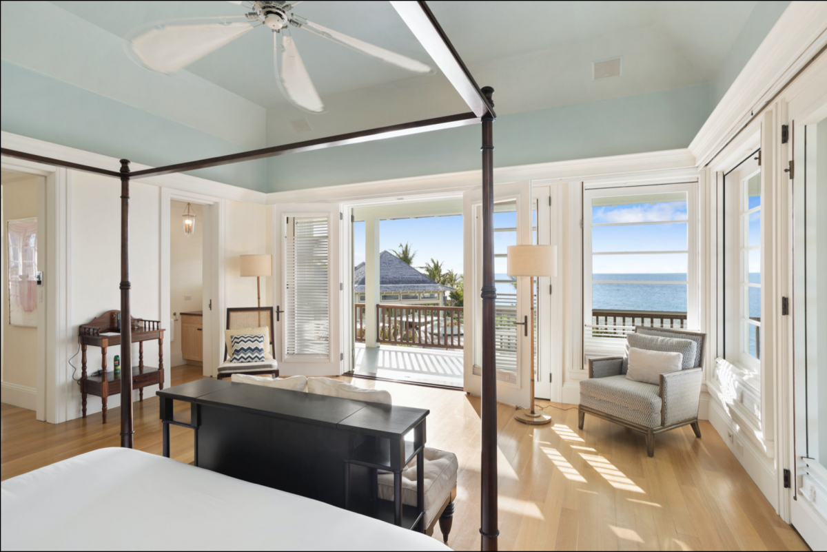 Primary Bedroom 3: This room is located in the Grand Villa on the second level. It is equipped with a king-sized bed, a day bed, air conditioning, access to a terrace, a sea view, and an ensuite bathroom with a bathtub, indoor and outdoor shower, and double vanities.