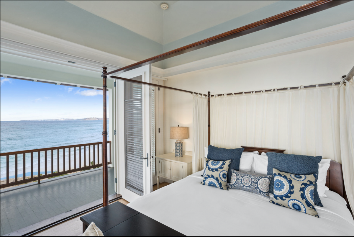 Primary Bedroom 2: This room is located in the Grand Villa on the second level. It is equipped with a king-sized bed, air conditioning, access to a terrace with a sea view, and an ensuite bathroom with a bathtub, indoor and outdoor shower, and double vanities.