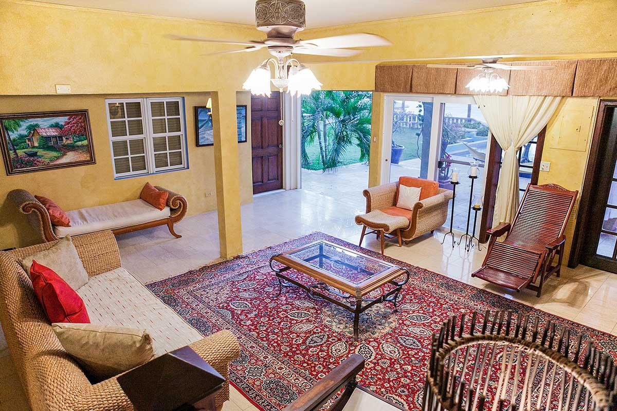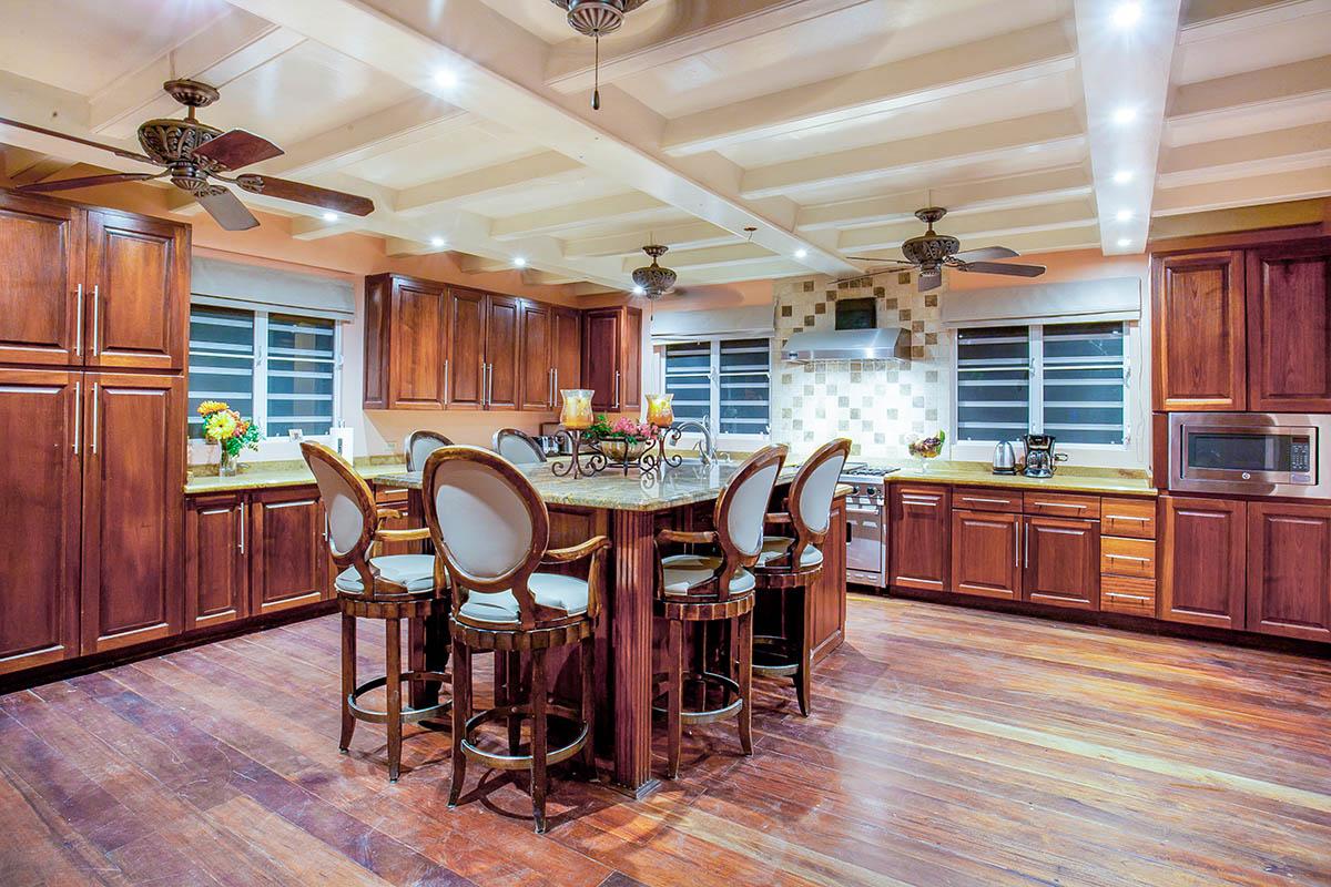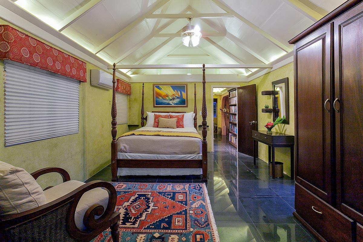 Viewfort Estate has a four-bedroom main house and four individual bedroom suites. The villa’s main house features spacious living and dining areas whose refined furnishings showcase Caribbean style. Large windows and soft pastel tones on the wall lend a breezy, serene feel. In the expansive kitchen, an oversized center island has a breakfast bar with high-backed stools for comfortable, casual meals. Other perks in the main house include a home entertainment unit, extensive library and Wi-Fi throughout the property and grounds.