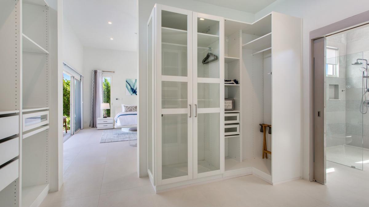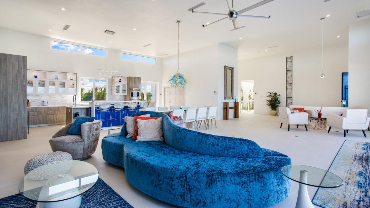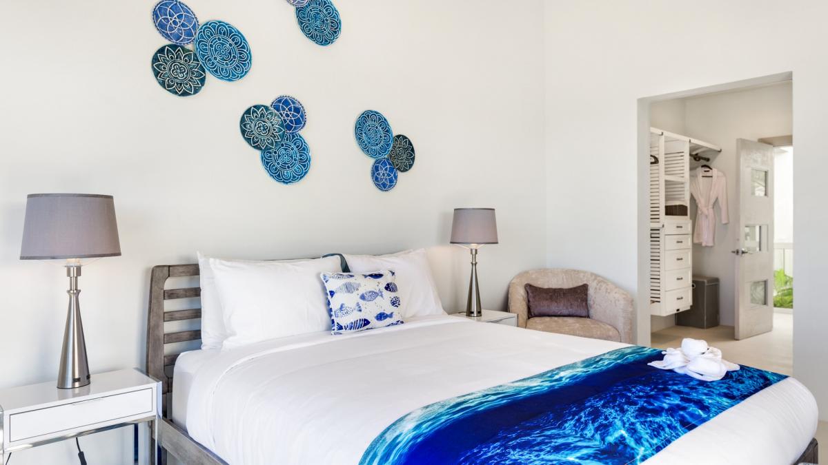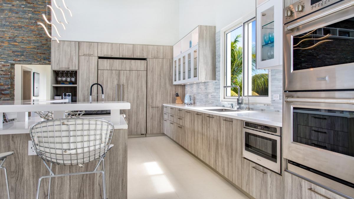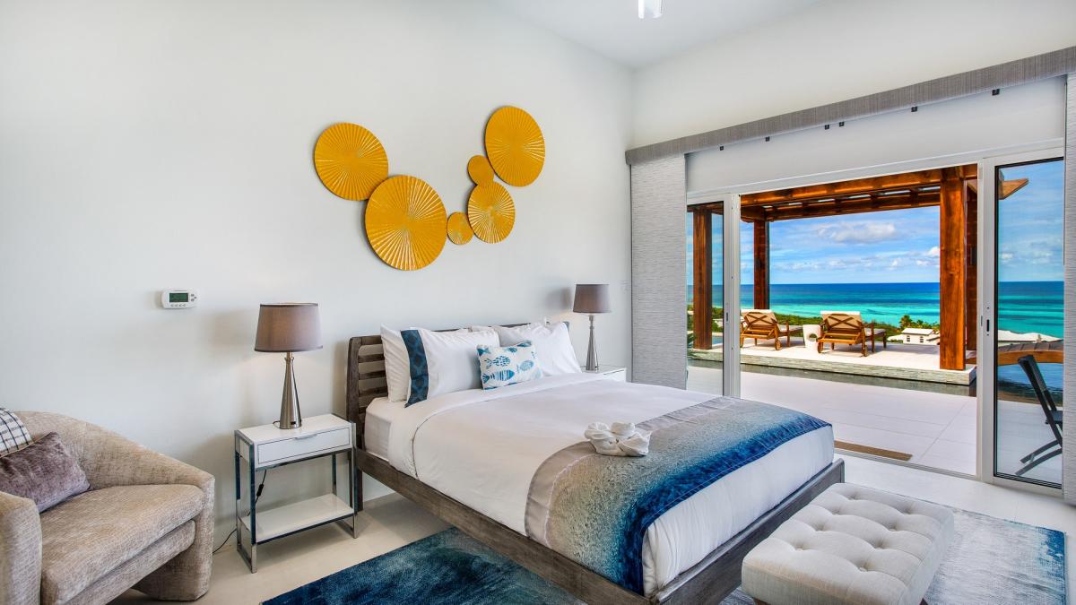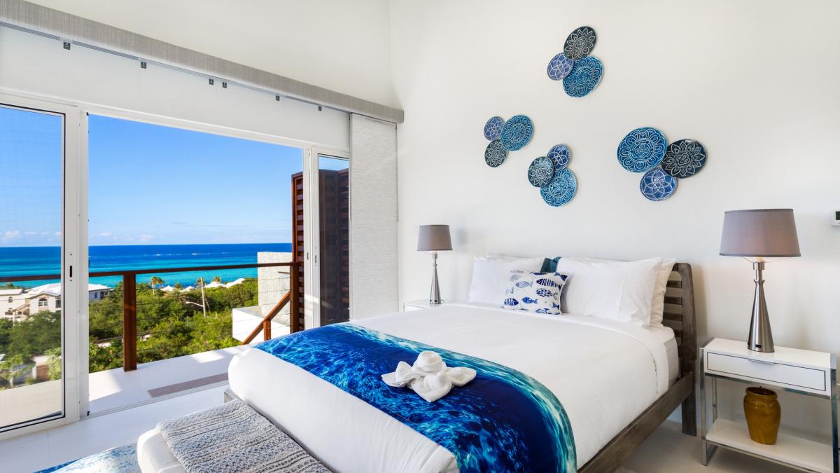 With five bedrooms and six bathrooms, Villa Alkera holds strong to its ocean allure by exuding modern energy with bold, striking color pairings of ocean blue patterns and hues. Each bedroom has decor that embraces the overall ocean theme charm of Villa Alkera. The kitchen is fully equipped with a double oven, a hidden integrated fridge/freezer, a full gas range and grill, a coffee maker, and everything else needed for guests to serve up a warm and delicious meal. The villa's massive panel doors, panoramic ocean views, walk-in closets, walk-out patios, and self-contained kitchen units vary between rooms.
