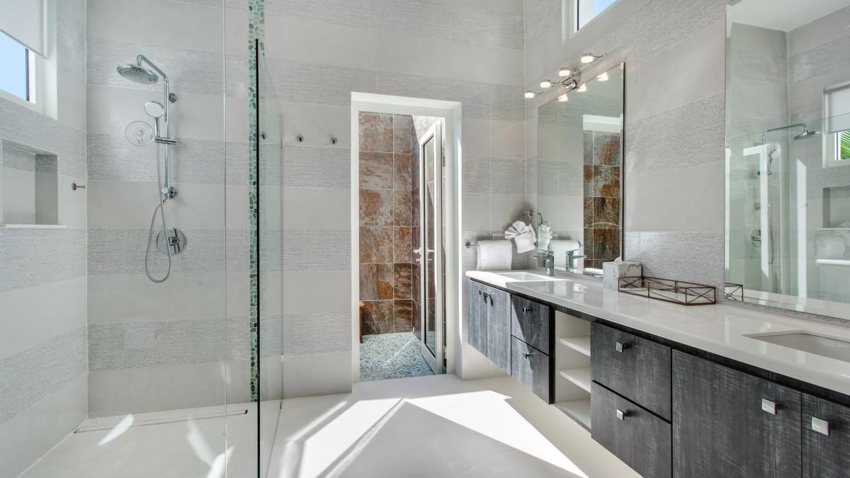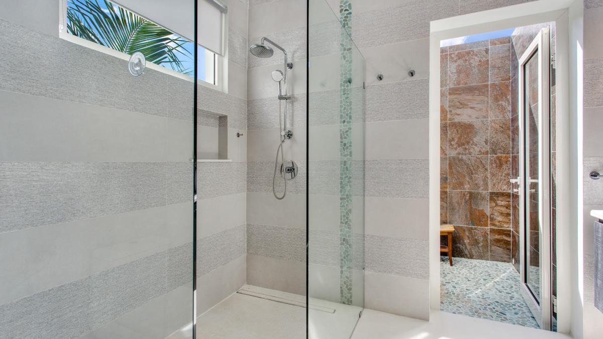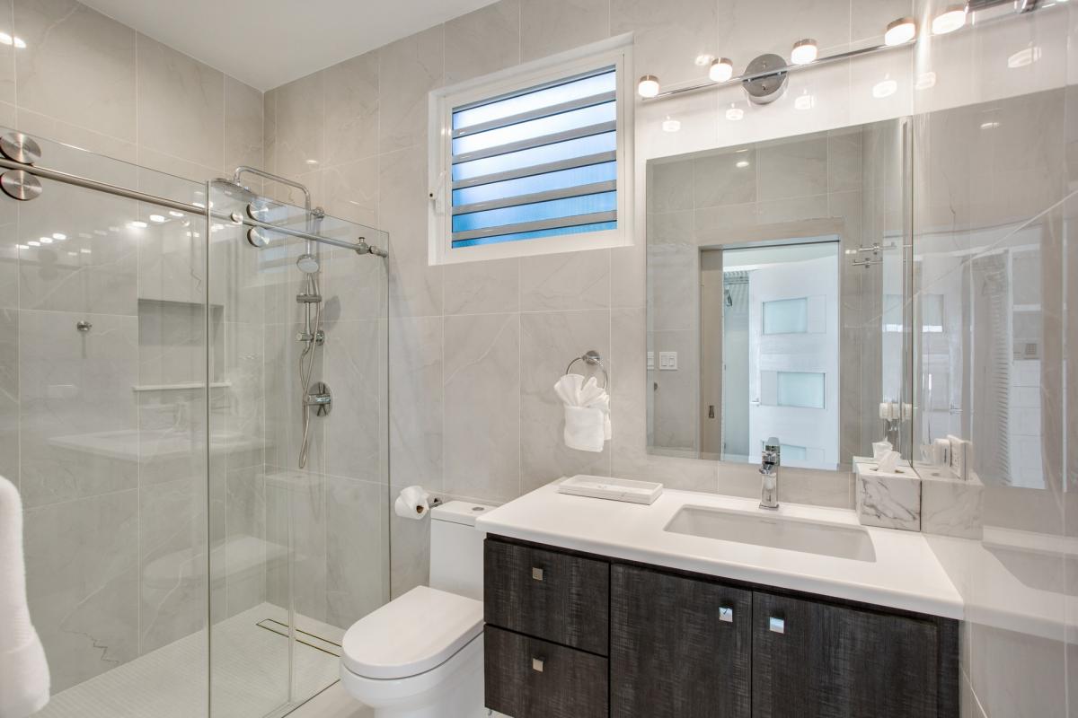 Primary Bedroom: This room is equipped with a king-sized bed and an ensuite bathroom with two sinks and an additional outdoor shower. Primary Bedroom also has ocean views and exterior access.