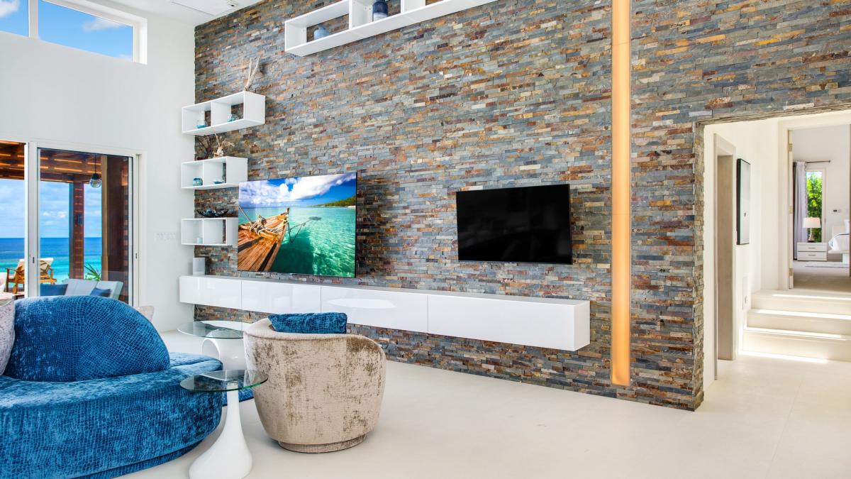 Just under the surface of Villa Alkera, built on Anguilla's limestone rock, there is a partially underground recreational area with vaulted ceilings, dark earthy tones, low lighting, and exposed limestone that create a contrasting escape. There is also a cozy adjacent private office that allows guests to work while still embracing ocean views if necessary. This Caribbean escape also has an in-home gym for guests to work out on vacation. Villa Alkera is a great place for guests to relax and unwind.