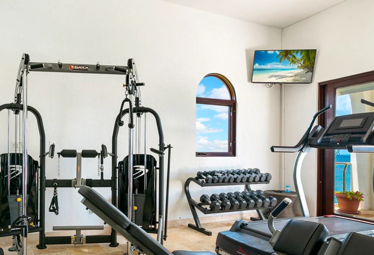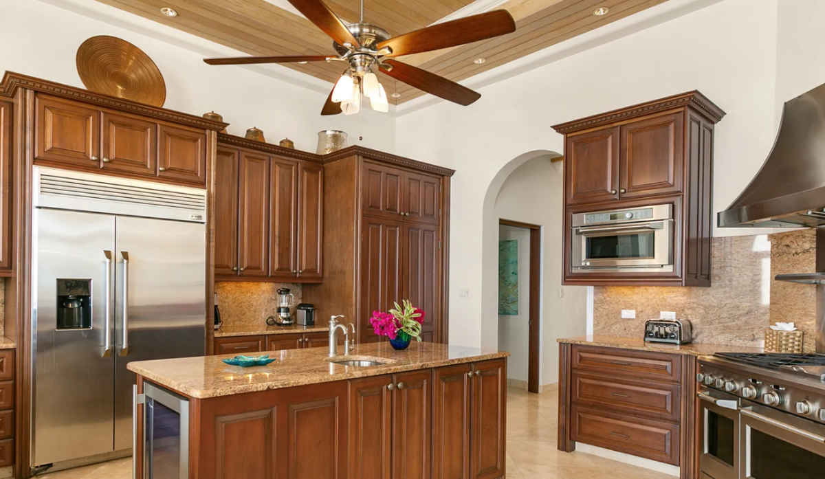 Perfectly designed for entertaining, the expansive outdoor terrace features a bar, grill, and ample lounging space beneath the stars. On the main floor, four generously sized king suites provide comfort and privacy—two of them with direct access to the pool deck. For added seclusion, the upper level houses a private guest apartment, complete with its own living and dining areas, kitchenette, and a fully equipped gym for fitness-minded guests.
