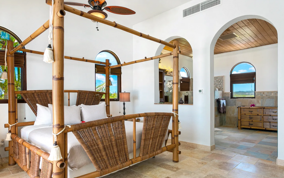 Bedroom 4: King bed, ground floor, ensuite bathroom with soaking tub, indoor and outdoor shower, double vanity, AC, ceiling fan, TV, desk, seating area, garden and partial ocean view