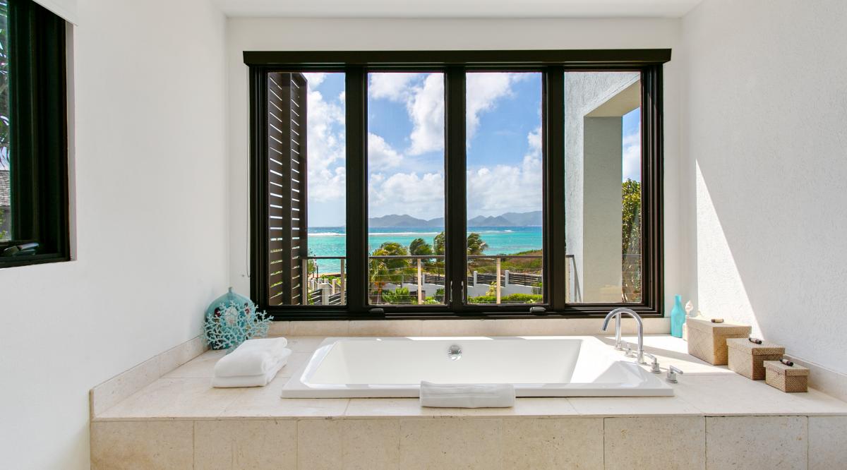 Primary Bedroom: This room is located on the upper level and is equipped with a king-sized bed, air conditioning, a ceiling fan, a television, and an ensuite bathroom with a freestanding bathtub, indoor and outdoor showers, and double vanities. The Primary Bedroom also opens onto a furnished terrace with a view of the sea and St. Martin in the distance.