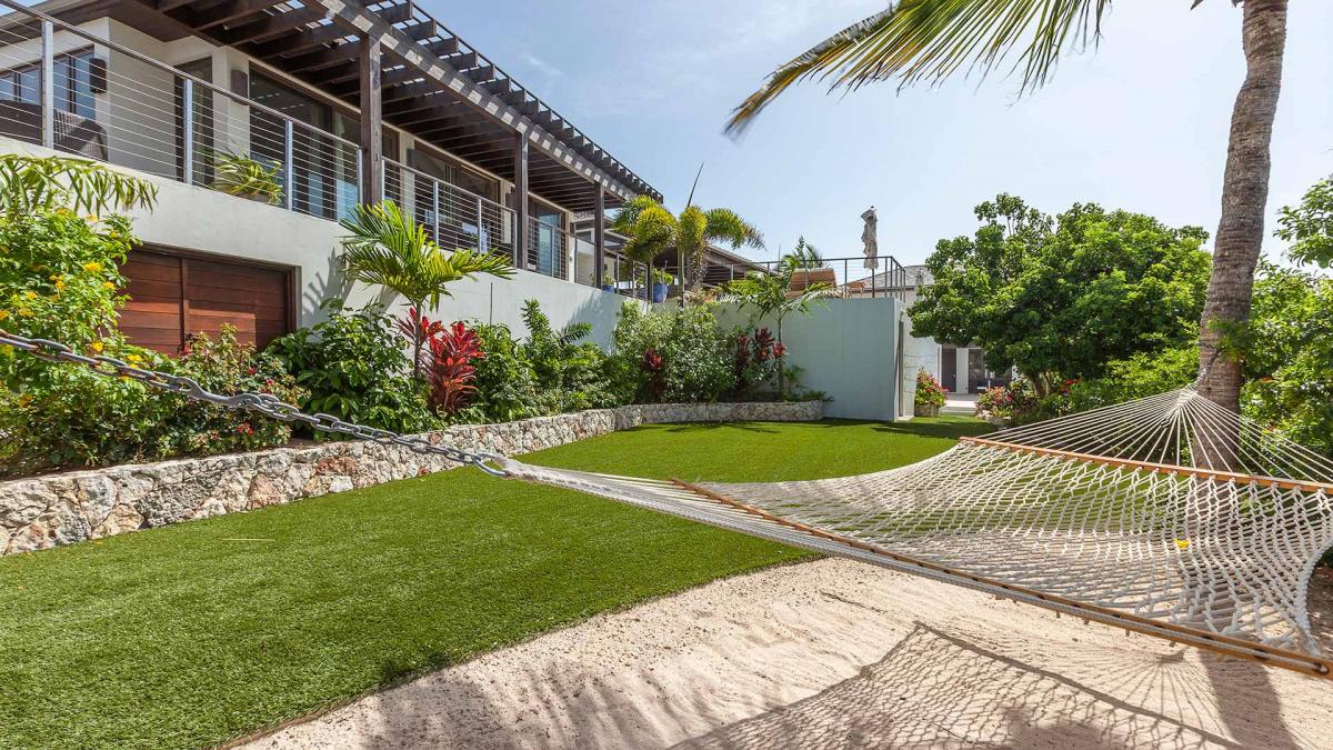 Villa Odyssey offers an artificial turf where guests can enjoy games such as cornhole, and it also has a natural grass area where guests can play kickball or croquet. This Anguilla rental also offers an entertainment area with couches, a bar, fire pit, stools on the beach, and an outdoor screen and projector for the perfect way to end a day.