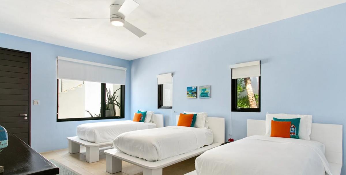 Bedroom 3: This room is located on the lower level and is equipped with a king-sized bed, air conditioning, a ceiling fan, a television, and an ensuite bathroom with a soaking bathtub, a walk-in shower, and double vanities. Bedroom 3 also opens onto a furnished terrace with views of the Caribbean Sea and St. Maarten in the distance.
