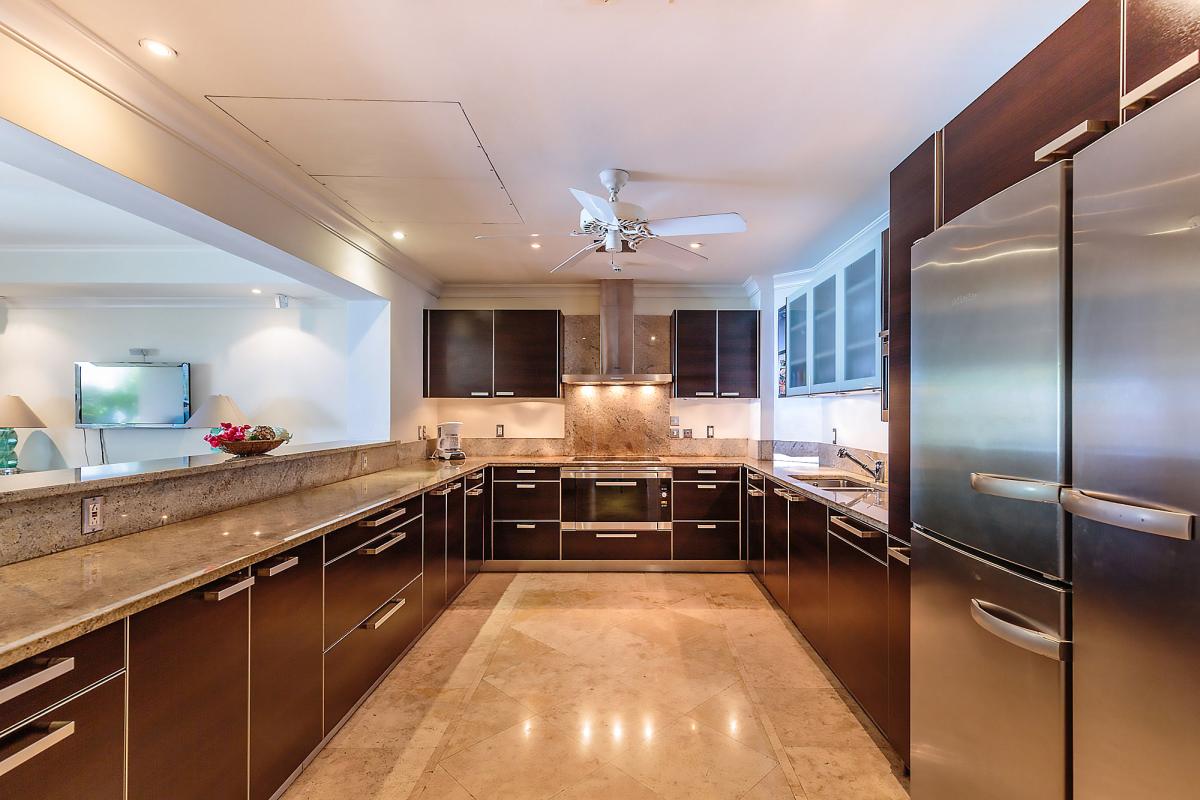 Inside 201 Sandy Cove, there is a luxurious kitchen featuring sleek marble countertops and premium Miele appliances including a double freezer, hop, dishwasher, double oven, steamer oven, and a built-in commercial-grade coffee machine. This kitchen provides guests with everything they need to create a culinary masterpiece.