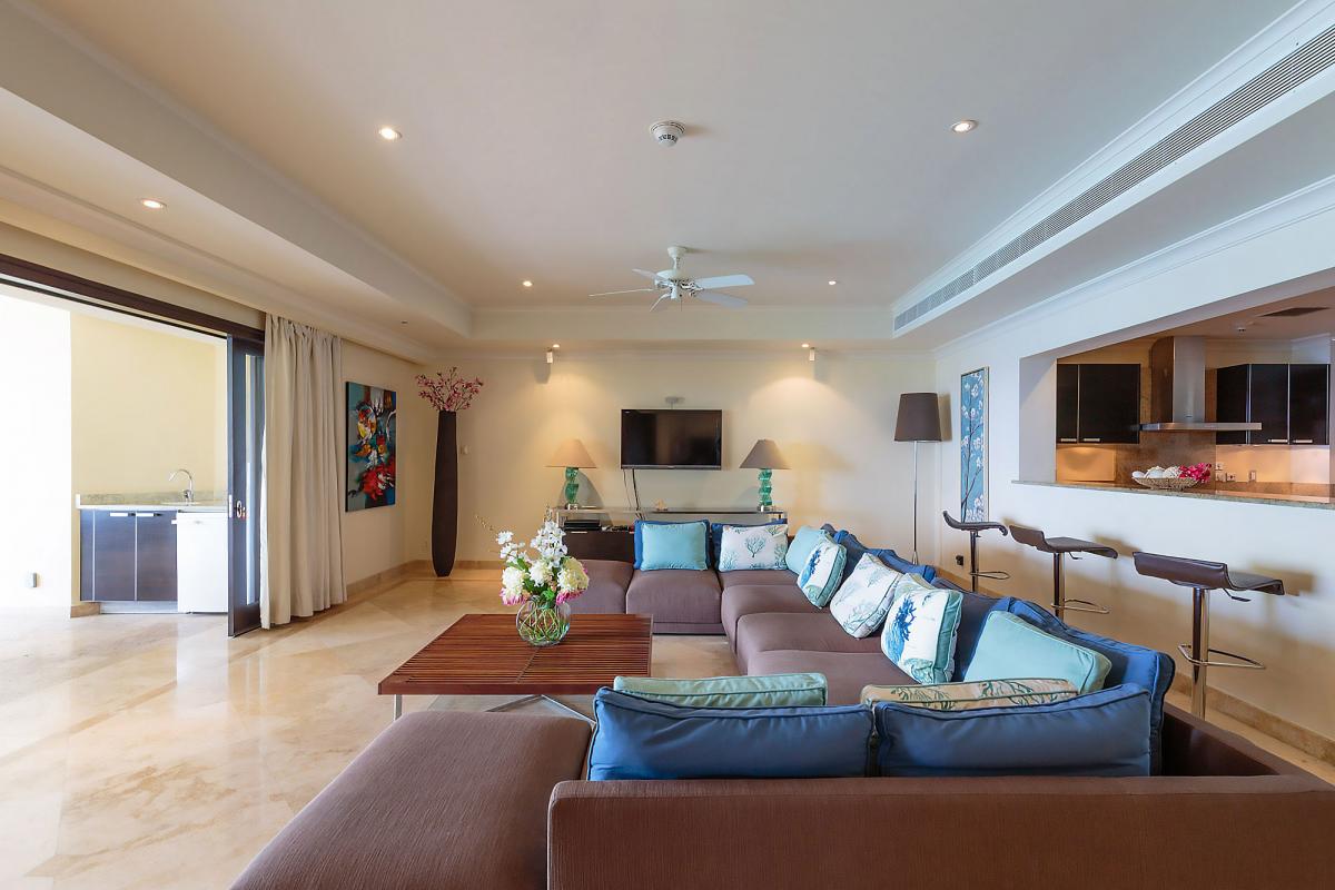 Inside, an open-plan living area is also perfect for entertaining. This area has a flat-screen TV, surround sound, and sliding glass doors that open to the terrace. Three nicely sized bedrooms each equipped with air conditioning, ceiling fans, and ensuite bathrooms. The master bedroom has a prime seafront location.