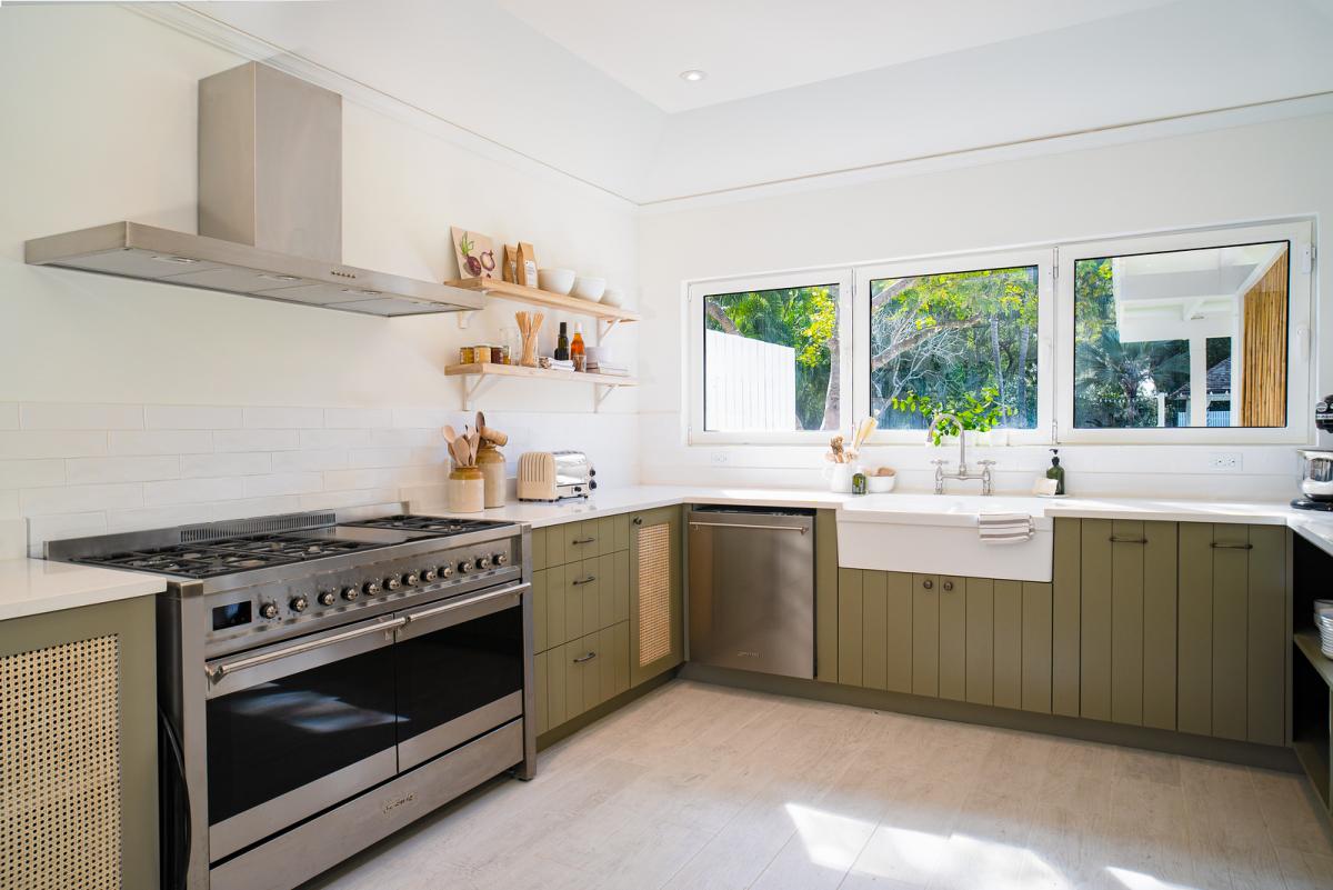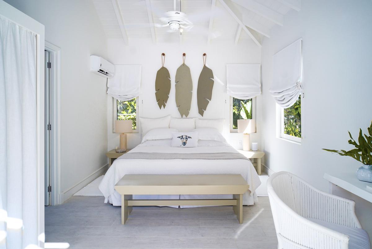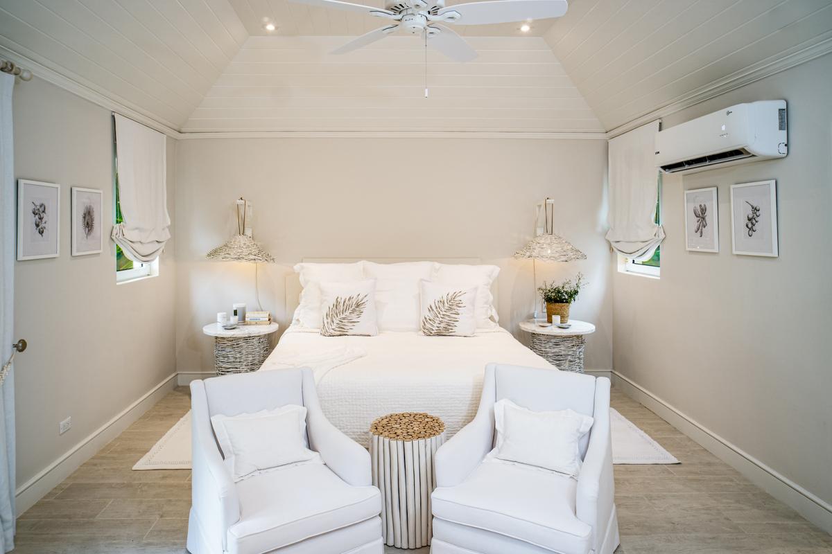 This Barbados rental features five bedrooms, all on one level, designed for relaxation and entertainment, with decor in calming whites, earth tones, and greenery. The interior includes a garden-view sitting room, a dining area for twelve, and a master suite with an ensuite bathroom. Two additional bedrooms feature ensuite bathrooms with rain showers and unique washboard shelves. The fully renovated kitchen and adjacent buffet area cater to culinary experiences.