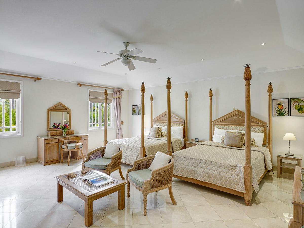 Bedroom 4: This room is equipped with two twin-sized beds, AC, a TV, a view of the garden, and an ensuite bathroom with a shower.