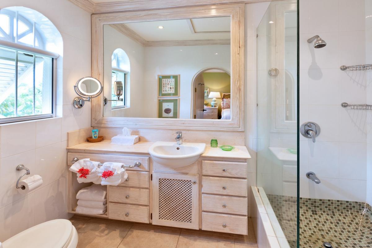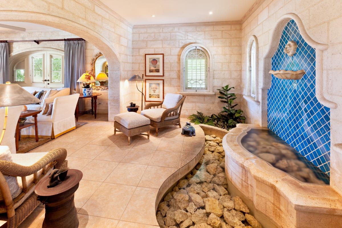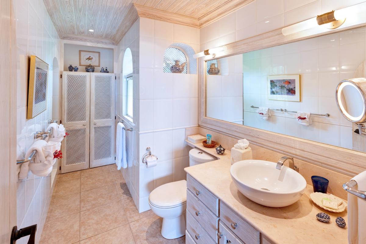 Guests will notice the nautical lifestyle immediately through the main hall. Each element draws your eye to the ocean and pool views just beyond a dramtic iron anchor and colorful lush landscape. A Roman-style fountain sits in a nook highlighting the coziness of Bonavista. Mahogany furnishings, antique Oriental rugs and polished antique mirrors decorate this impressive villa. A covered terrace hosts an alfresco dining area and wet bar.