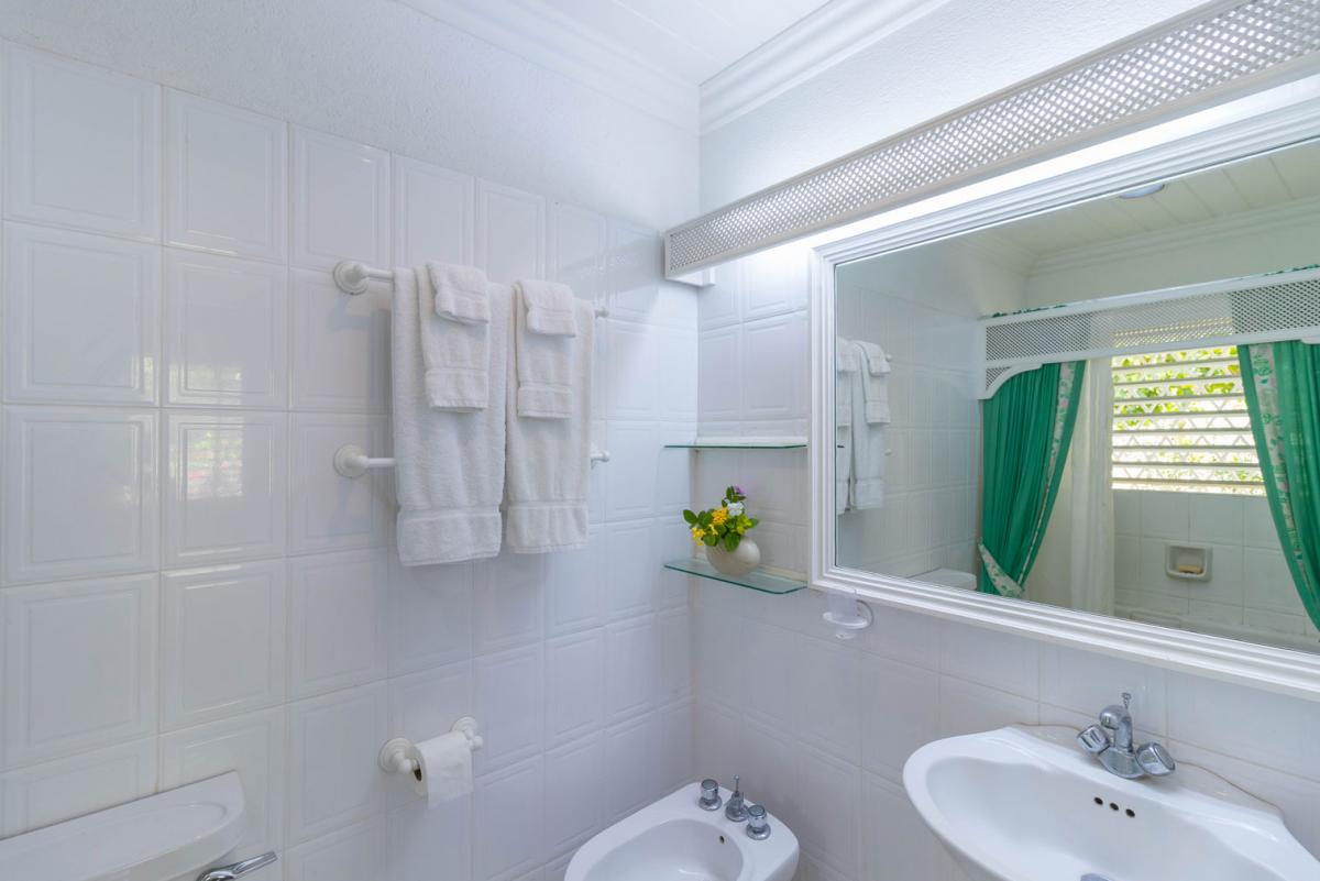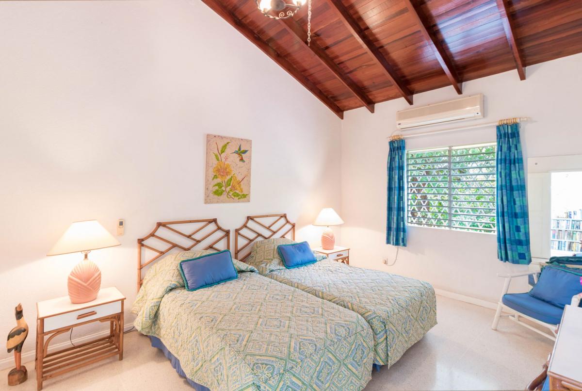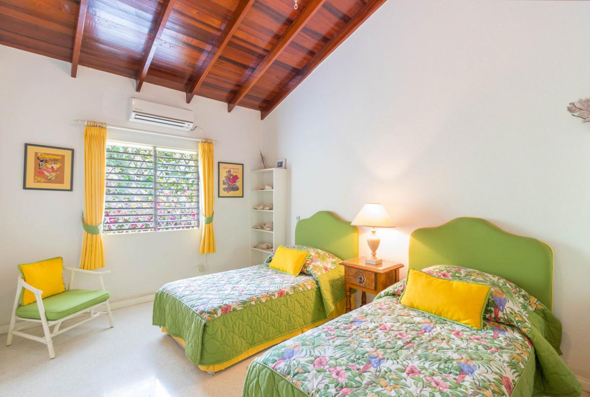 Bedroom 2: This room is equipped with two twin-sized beds, a garden view, AC, and an ensuite bathroom with a shower and vanity unit.