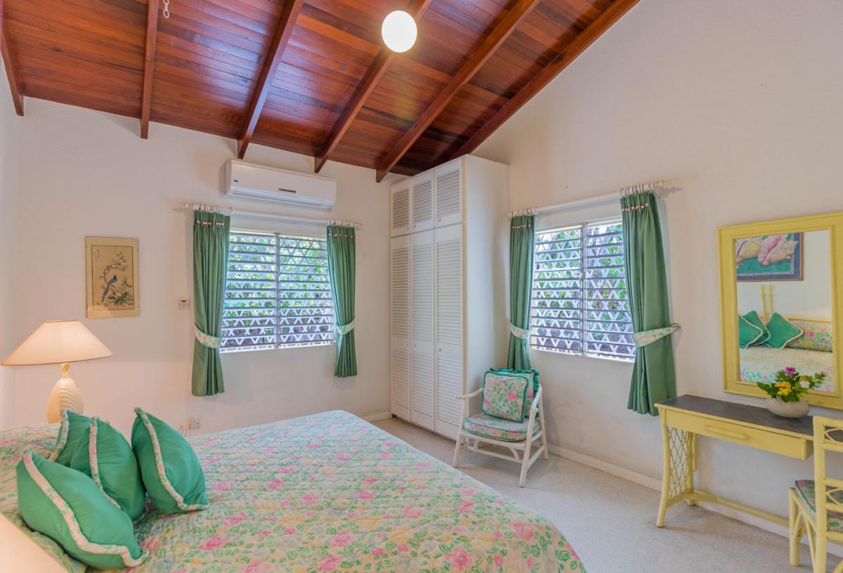Bedroom 5 (Apartment): This room is equipped with a queen-sized bed, a garden view, AC, a shared terrace, and an ensuite bathroom with a shower and a twin vanity. It is also wheelchair accessible.