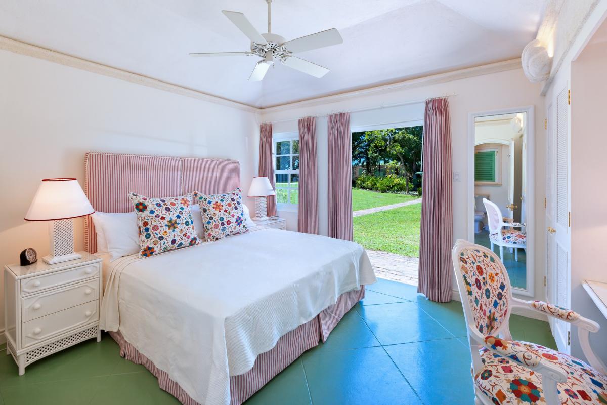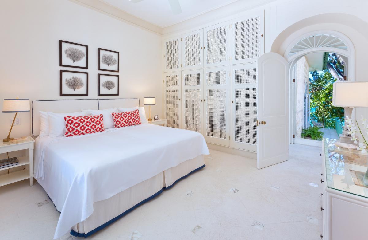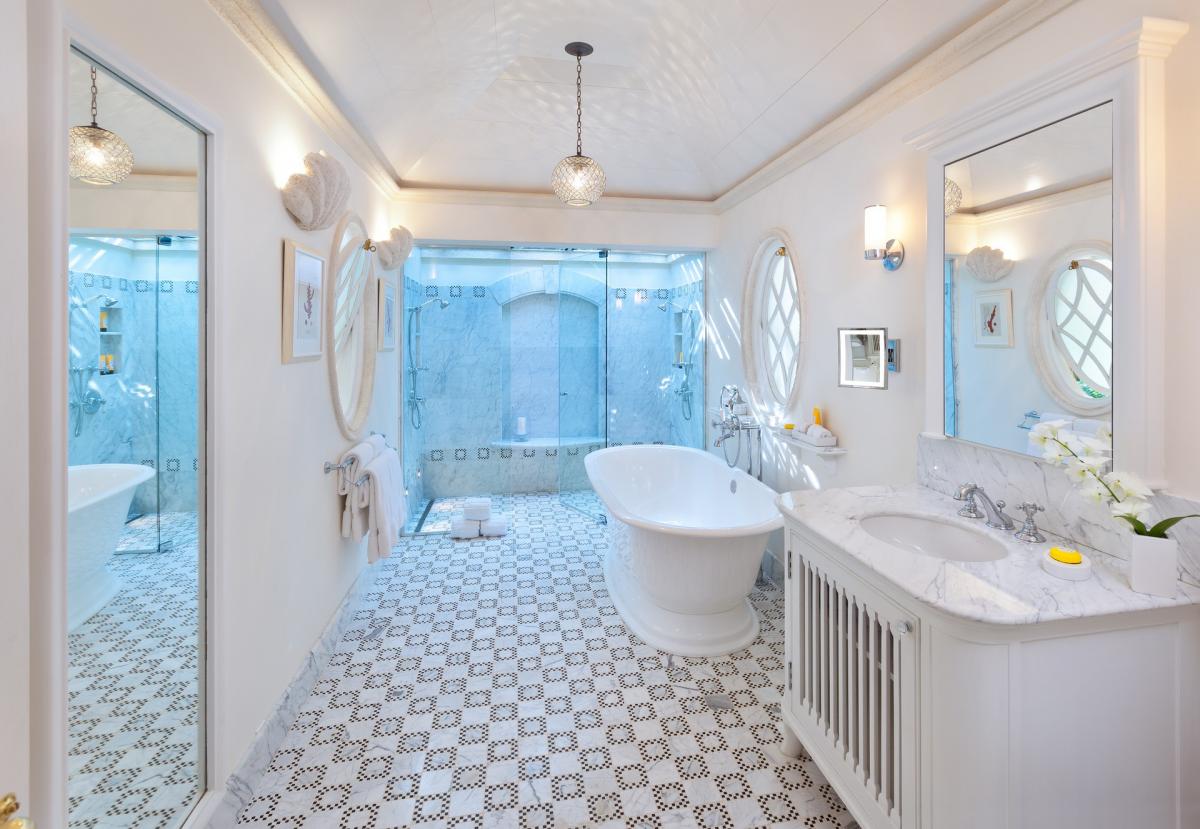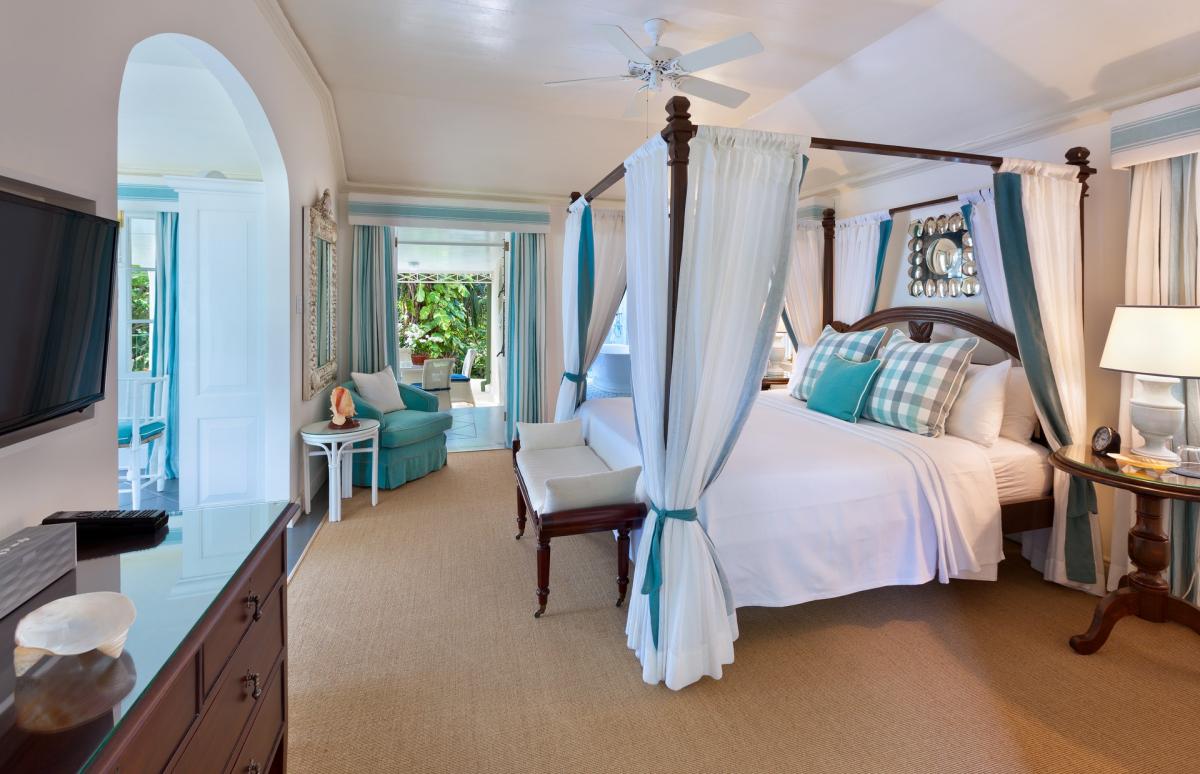 Bedroom 6 - Sunset South Room: king bed with a view of the infiity pool through to the Caribbean Sea, walk-through dressing room to ensuite bathroom with open air shower and double marble vanity. This suite connects to Sunset North Room.