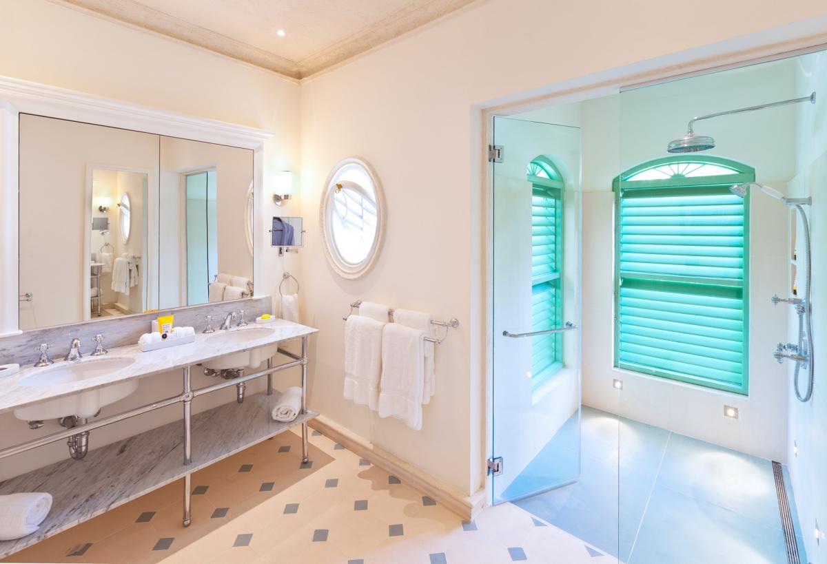 Bedroom 12 - South Suite: Two single beds (convertible to a king), ensuite bathroom with double vanity, tub, and shower
