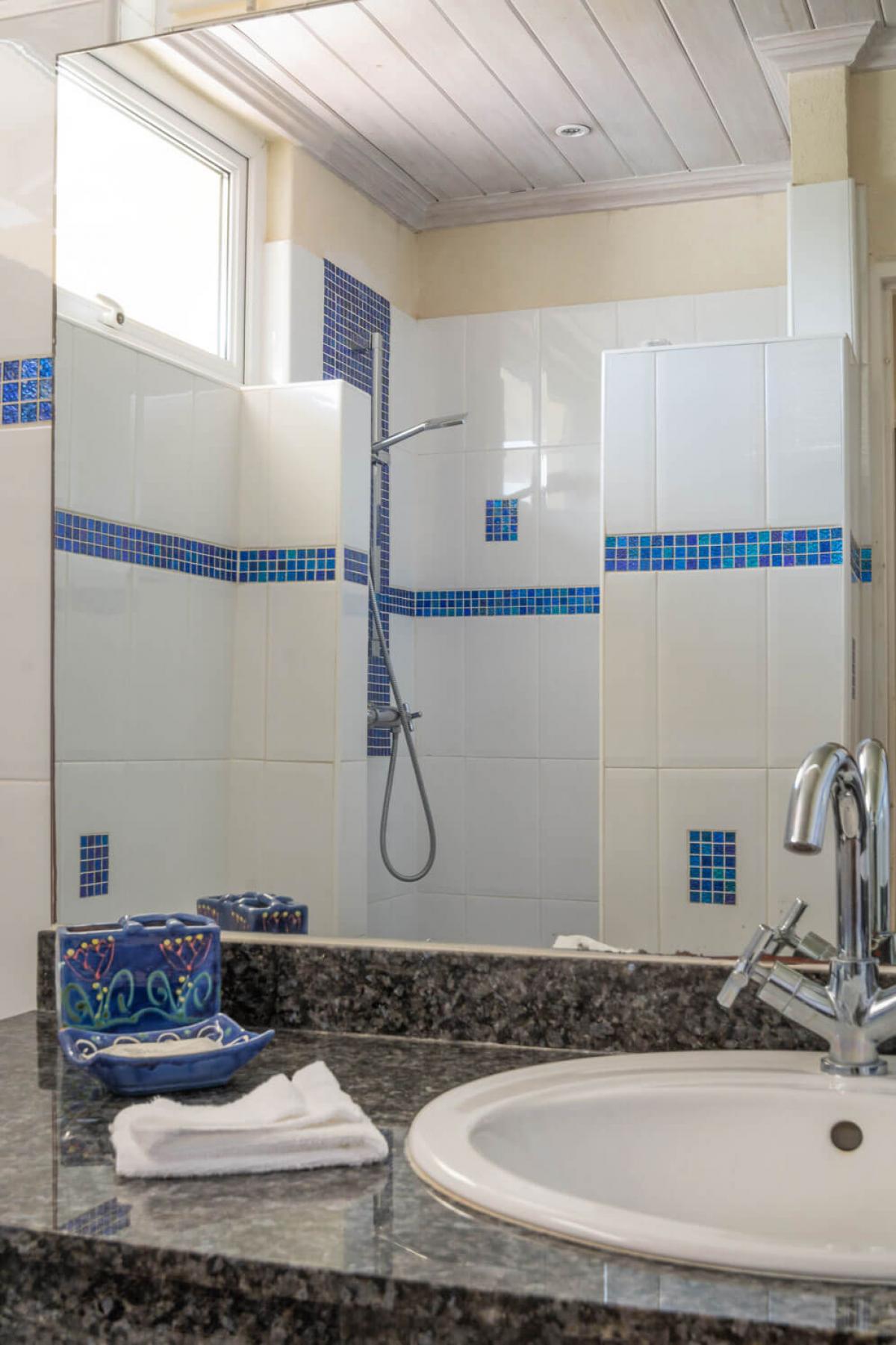 Bedroom 3: This room is equipped with a king-sized bed (which can be converted into two twins), air conditioning, a ceiling fan, a safe, and an ensuite bathroom with a freestanding bath and walk-in shower with a rain shower head. It is wheelchair accessible.