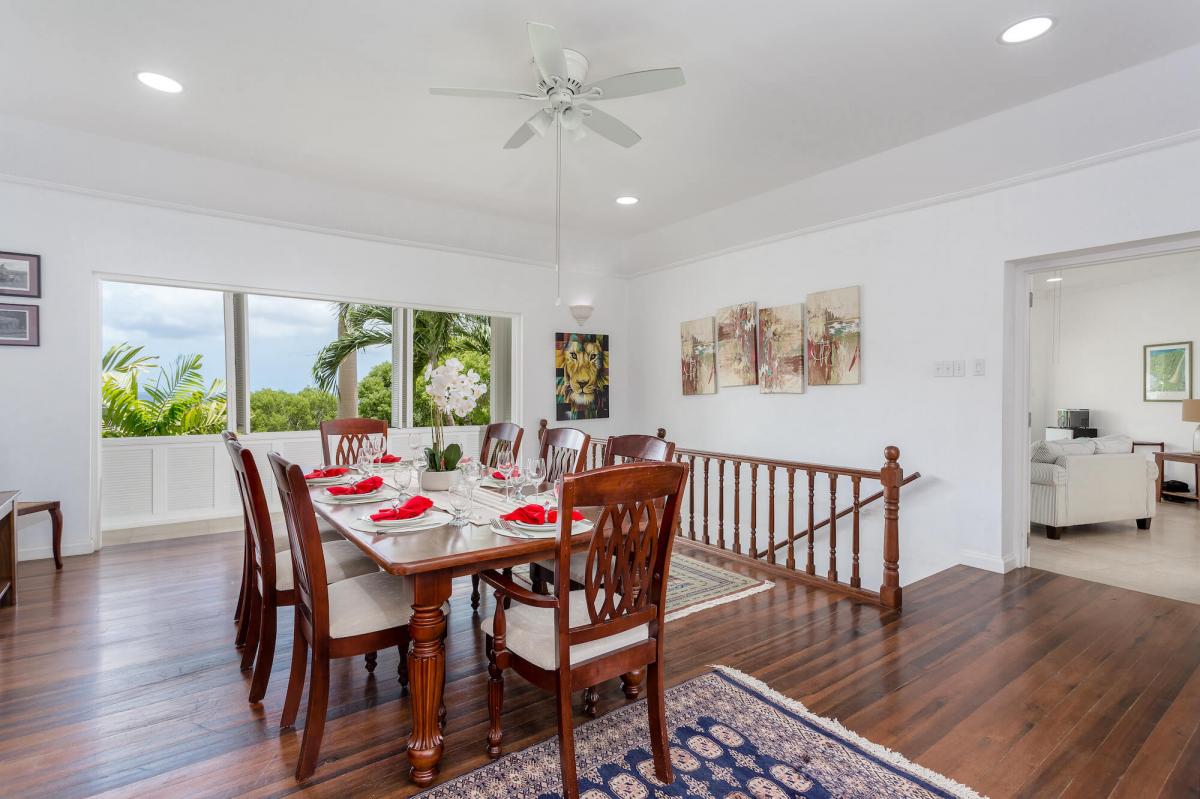 Halle Rose has over 6,000 square feet of covered living area and sits on more than two and a half acres, making it an excellent spot for relaxation and socialization. The villa has breathtaking sea views to the west, surrounded by majestic mahogany trees. To the south and east lies the Old Nine golf course, equipped with a clubhouse, bar, and tennis facilities. The entrance of Halle Rose welcomes guests to an elegantly furnished reception area that flows to the dining terrace that overlooks the pool and gardens. The dining terrace connects to the bedroom wings through an open corridor. To the right of the reception room is a family room that offers a casual space for relaxation. A formal dining room also connects to a fully equipped kitchen with a dumbwaiter for easy food delivery. The main level also houses a gym and a guest cottage with two bedrooms, a bathroom, living areas, and its entrance for extra privacy. The north hallway leads guests to the coral stone deck and pool area, which features sun loungers and umbrellas and connects to two of the spacious bedrooms. The south hallway leads guests to another bedroom and the primary bedroom suite.