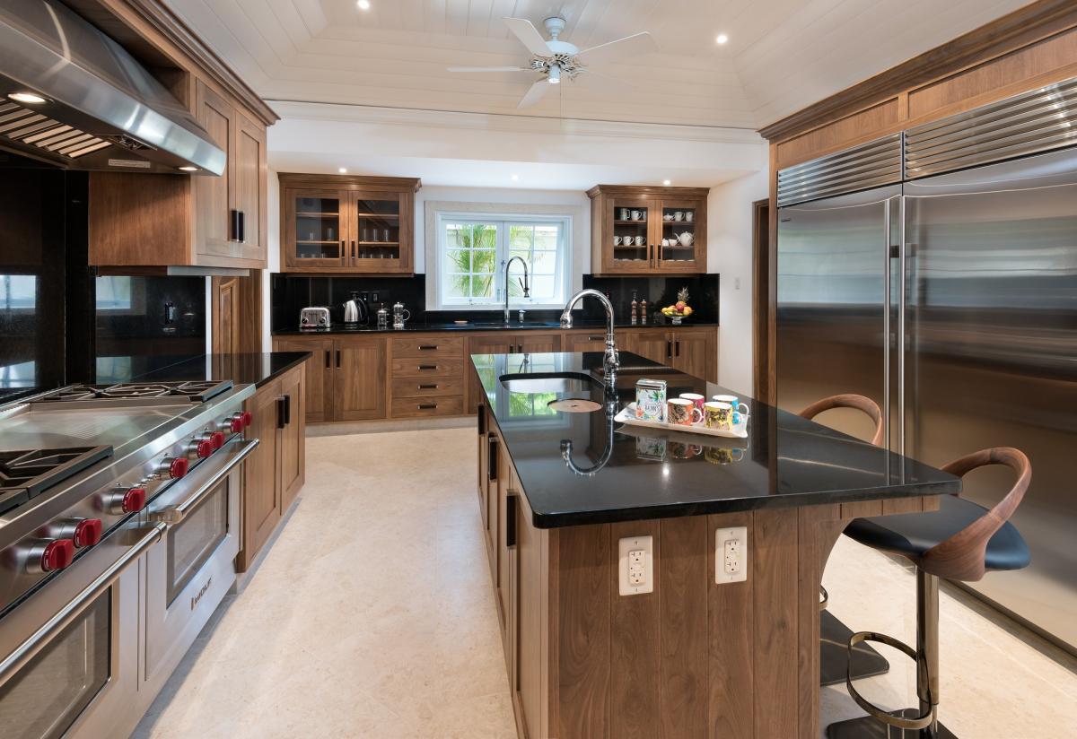 The indoor/outdoor accomodations incorporate an open floorplan with wrap around ocean view terrace. Another alfresco dining area is located on the veranda with colorful Kilim furniture, bespoke light fixtures and folding iron gates. The fully equipped gourmet kitchen is equipped with Miele and Wolfe appliances, a subzero double door fridge. The kitchen is also home to a fully equipped bar including two wine coolers and butler's sink.