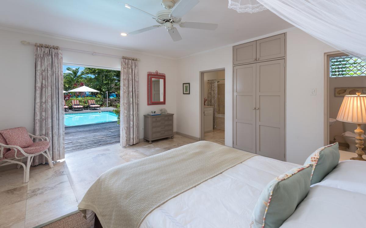 All four bedrooms of this Barbados rental are air-conditioned with en-suite bathrooms. The main bedroom features a "wet room" and direct pool deck access, while Bedrooms 2 and 3 also have pool access and are connected via a shared bathroom, making them ideal for families. Bedroom 4 is located near the entry foyer.