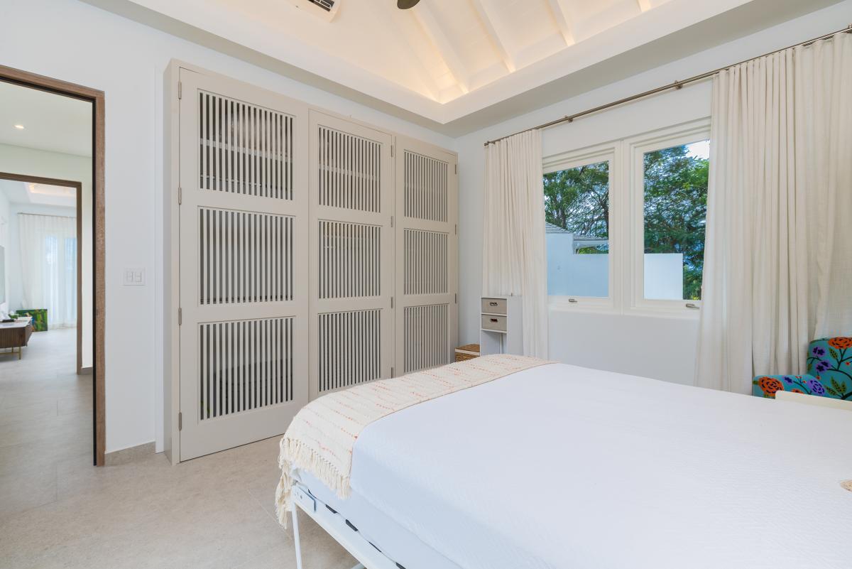 Primary Bedroom: King bed, ensuite bathroom with walk-in shower, AC, ceiling fan, security safe, sea view