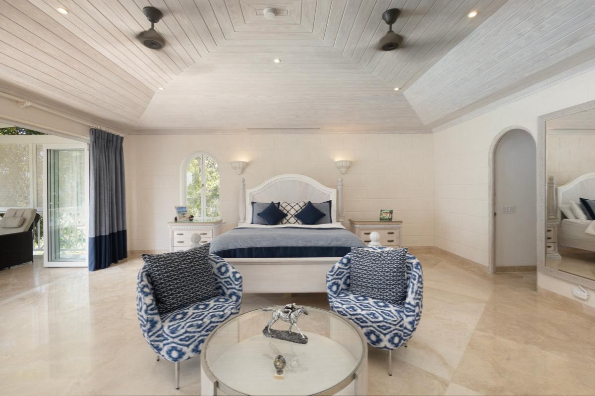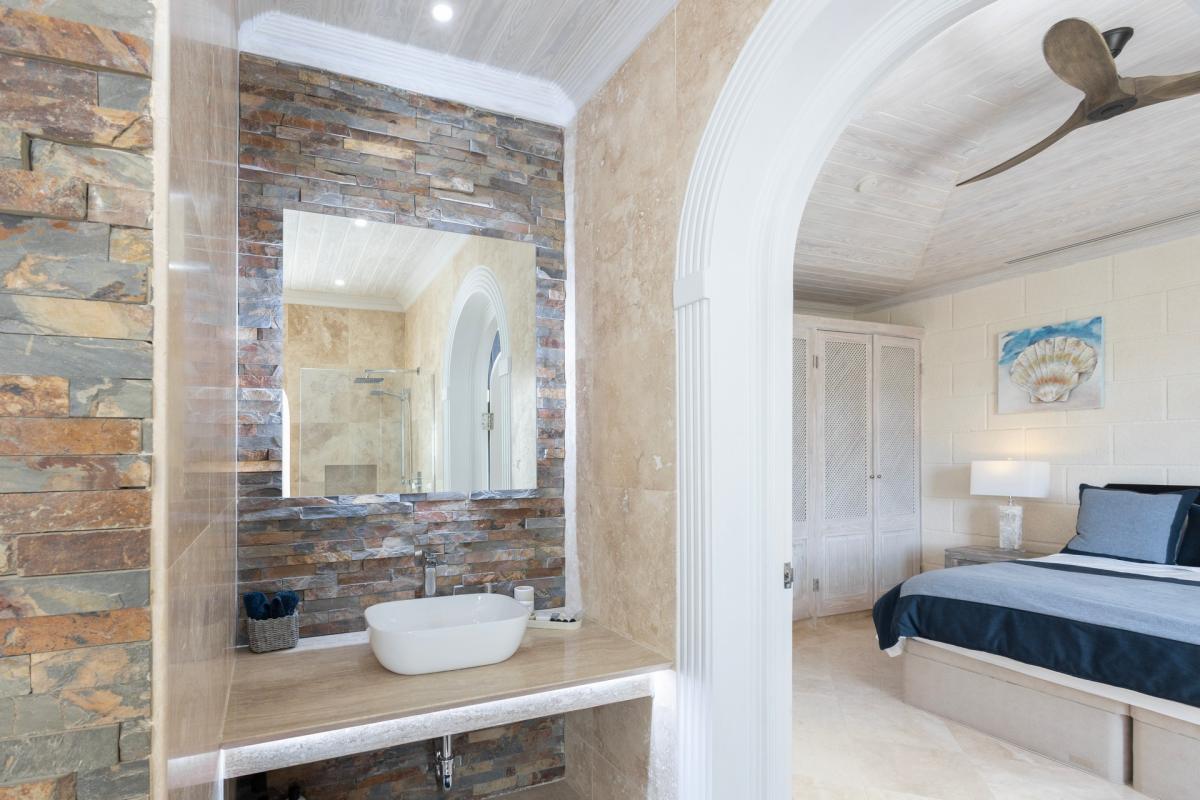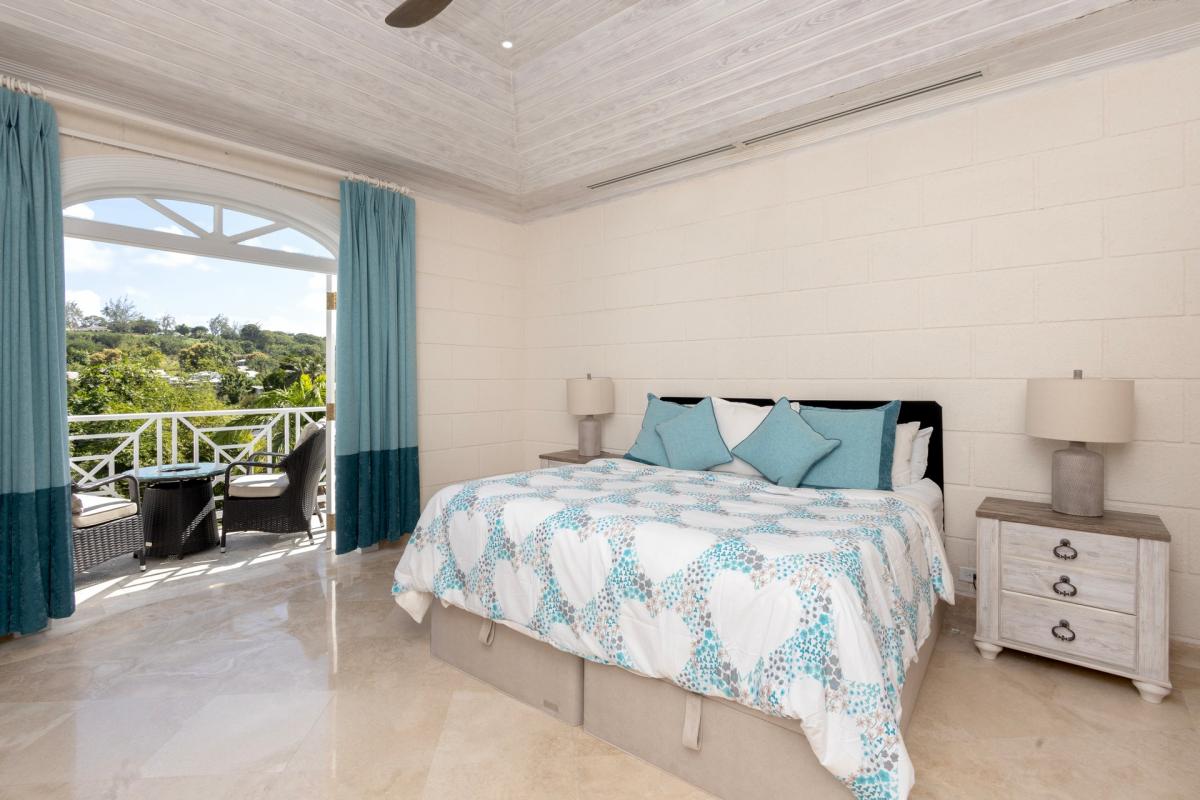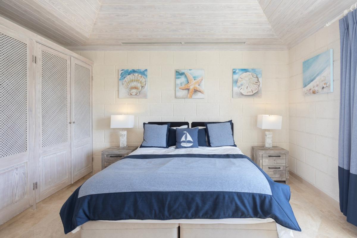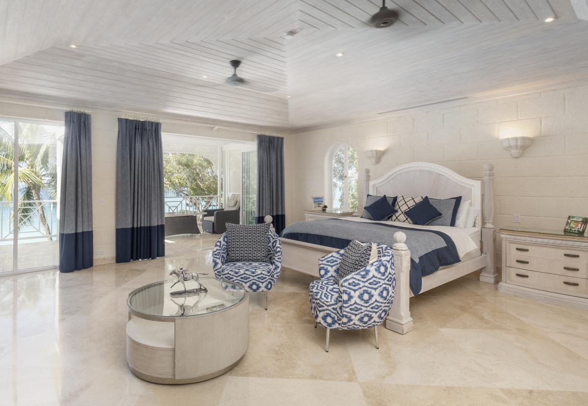 Bedroom 3: This room is equipped with a king-sized bed, an ocean view, AC, a ceiling fan, a TV, a private balcony, and an ensuite bathroom with a bathtub, a walk-in shower, and twin vanities.