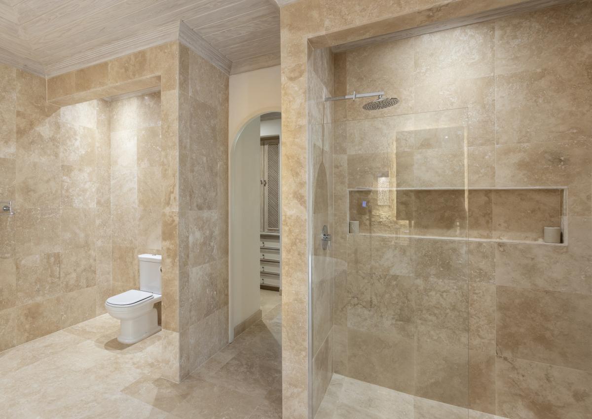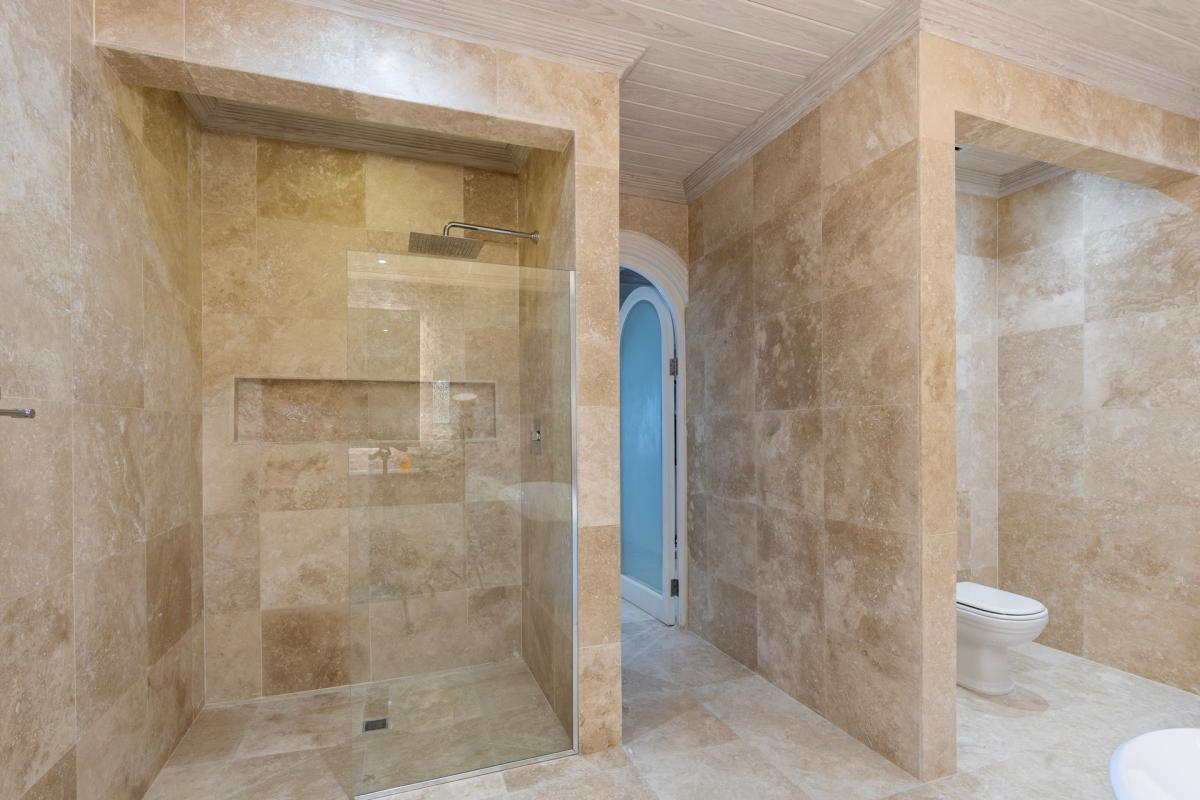 Primary Bedroom: This room is equipped with a king-sized bed, AC, a ceiling fan, Sonos System, a safe, a shared balcony, a walk-in wardrobe, a TV, and an ensuite bathroom with a freestanding bathtub, a walk-in shower, and twin vanities.
