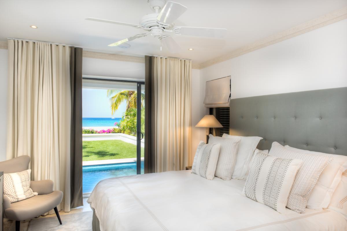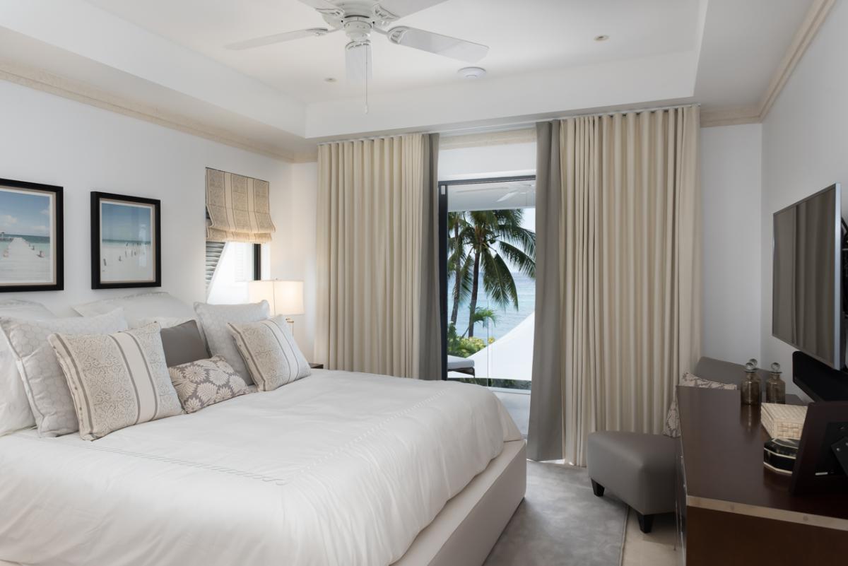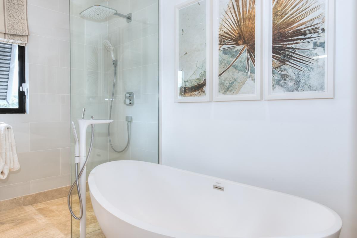 Bedroom 1: This room is equipped with a king-sized bed, AC, a ceiling fan, a TV, a walk-in wardrobe, a safe, a sea view, and an ensuite bathroom with a walk-in shower and a freestanding bathtub.