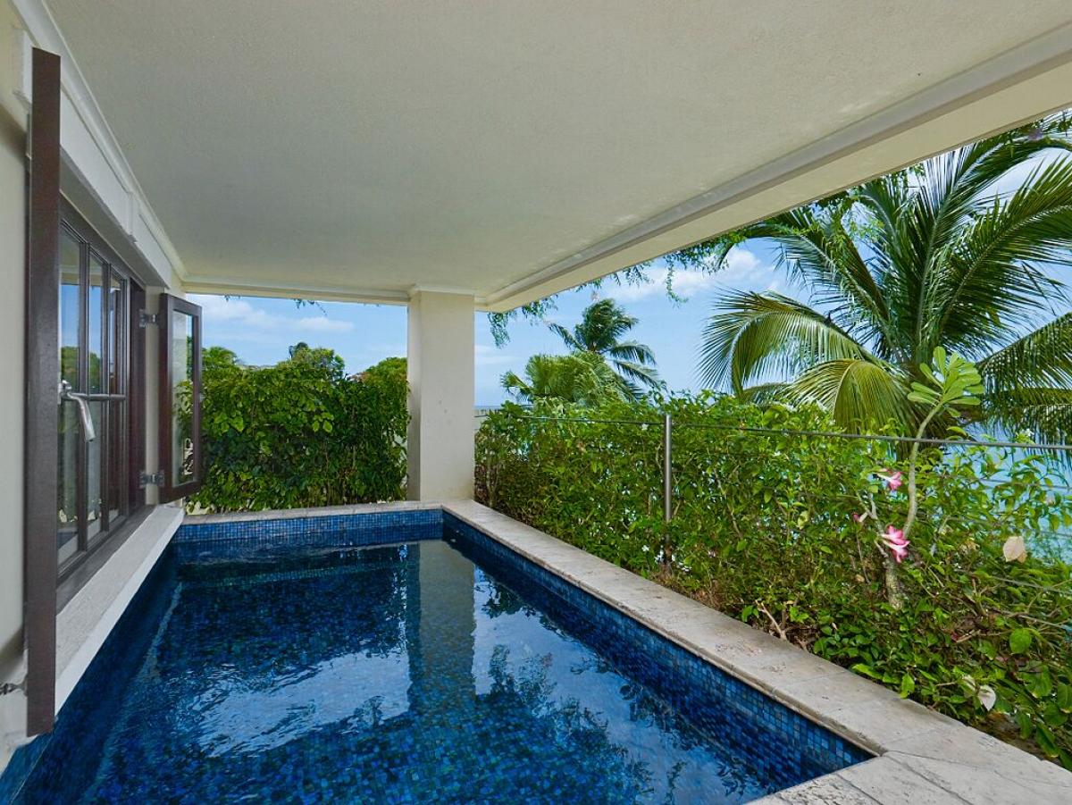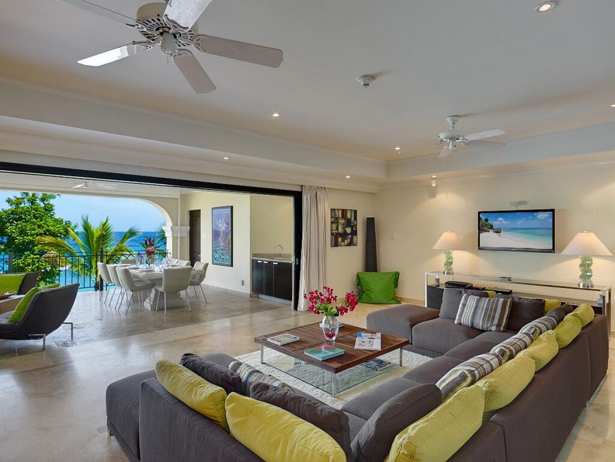 Sandy Cove 201, a 3,200 sq ft end unit, affords direct access (by stairs or elevator) down to the communal pool and right onto the beach. The covered terrace faces due west and provides stunning views of the incredible Caribbean sunsets. The terrace is fitted with a remote retractable awning and features a wet bar, fridge and private plunge pool.