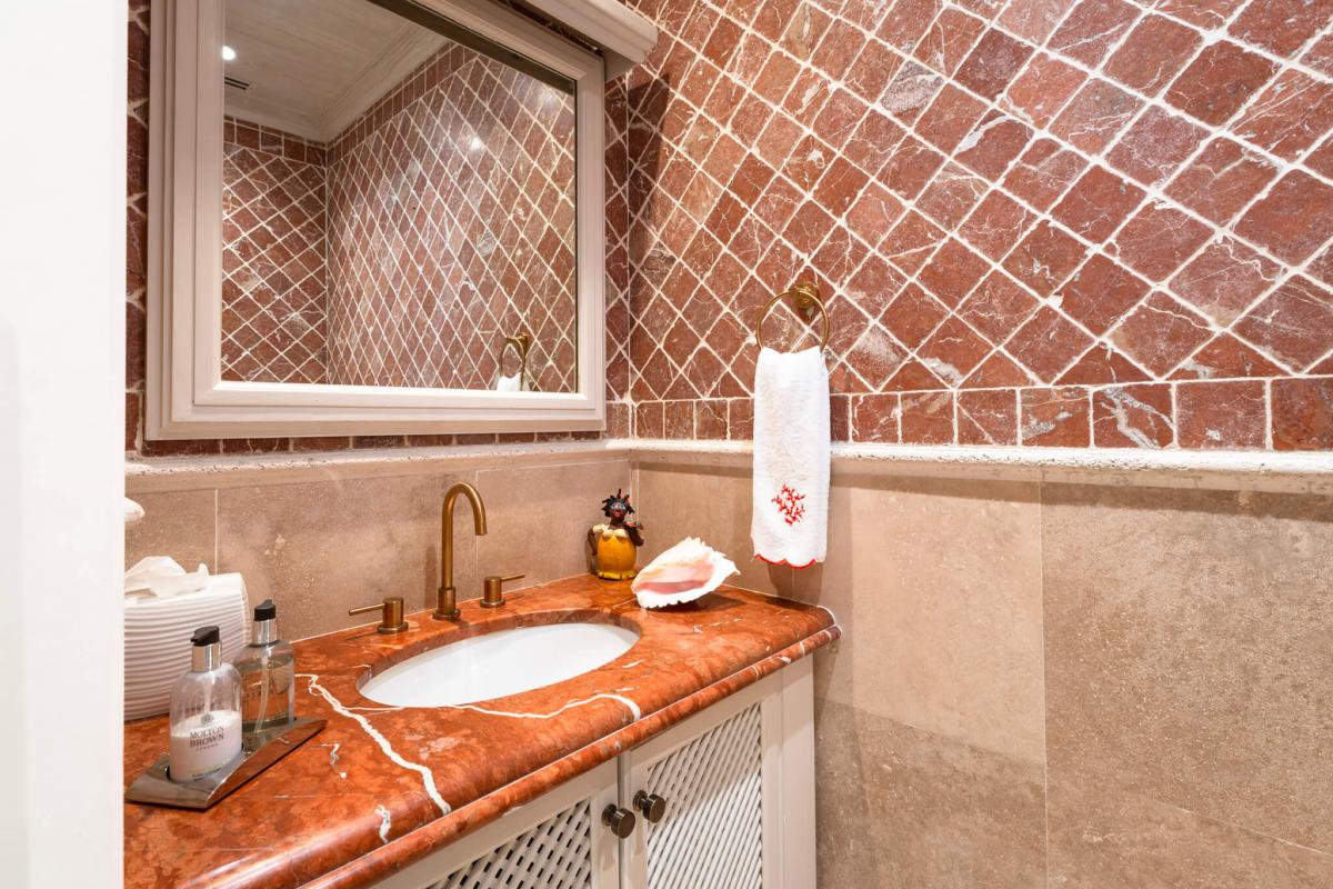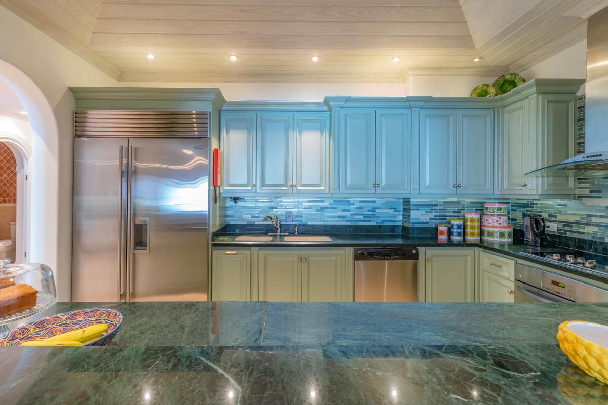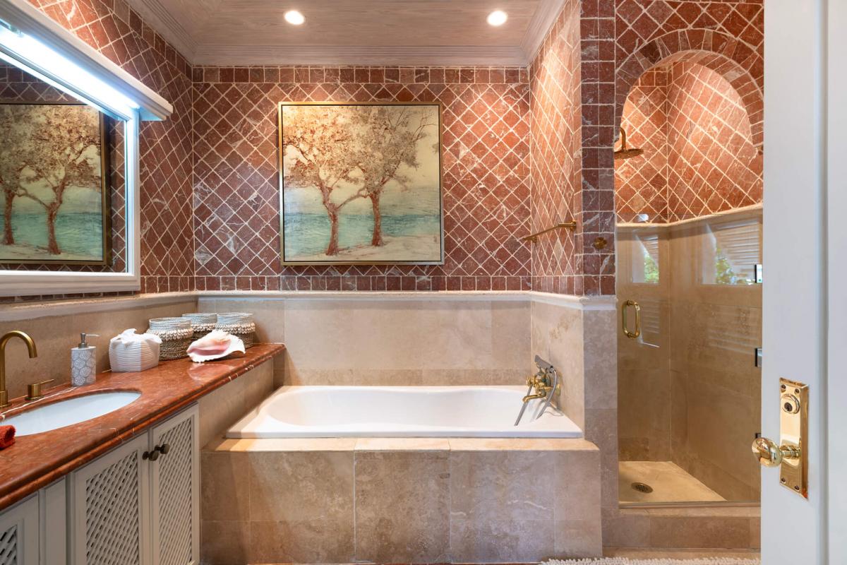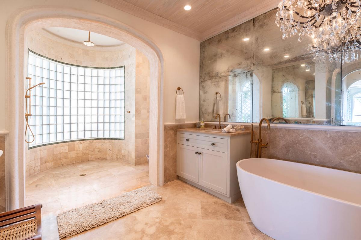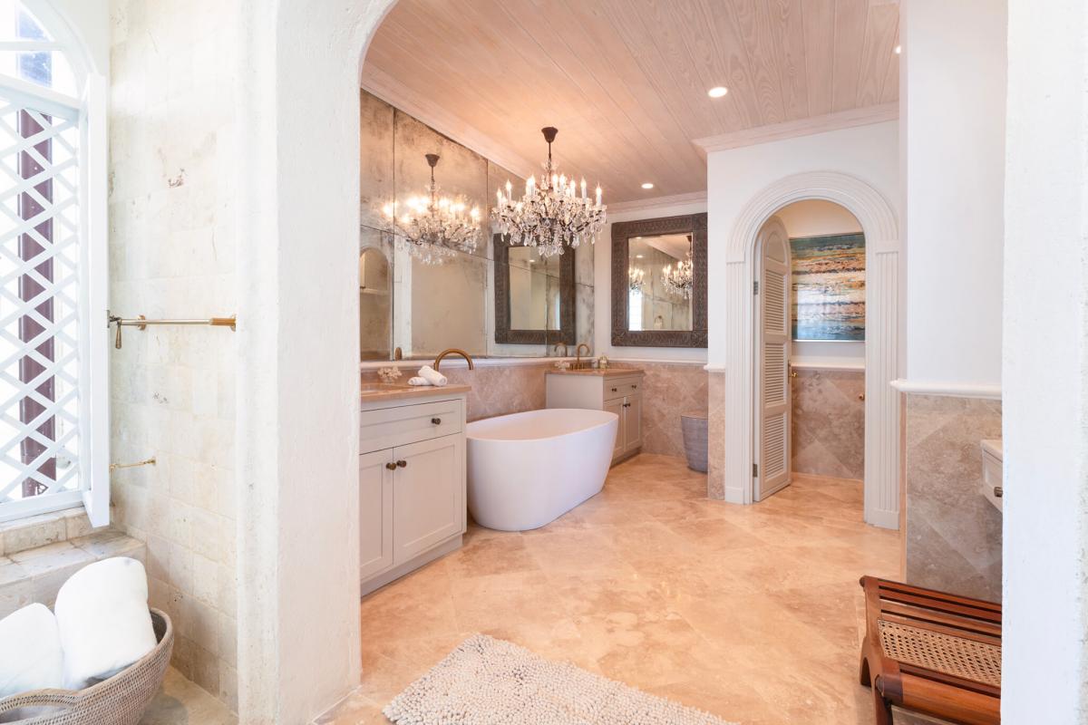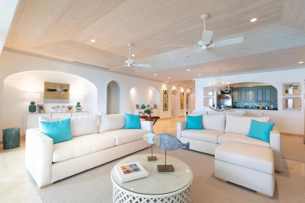 This apartment has a spacious open floor plan with a stylish living room, dining area, and a fully equipped kitchen. Sea Breeze also has three bedrooms, each with ensuite bathrooms. The primary bedroom suite is equipped with a jacuzzi bathtub, rain-effect shower, and French doors leading to a private terrace. A seamless transition to a private verandah with stunning views makes a perfect setting for al fresco dining or lounging in the Caribbean sun.